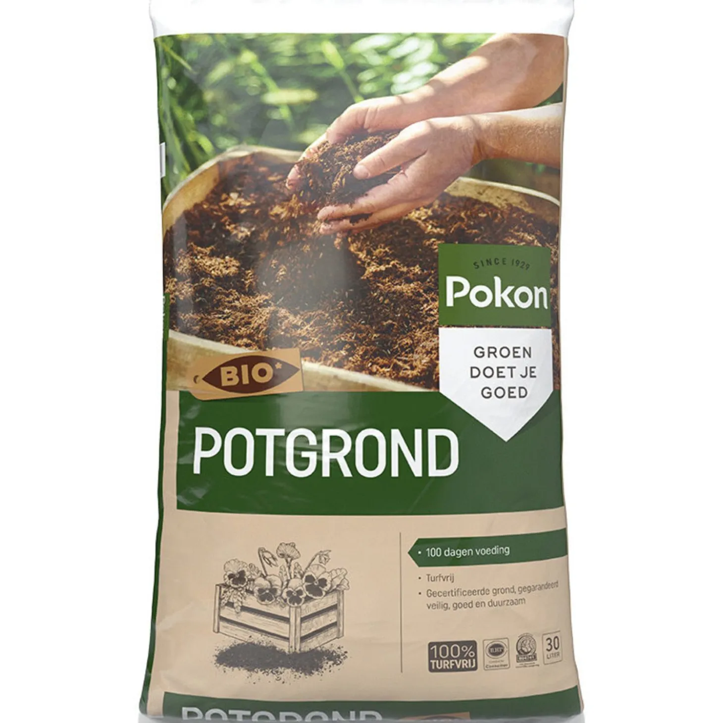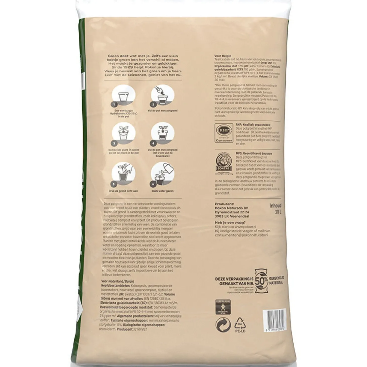 | Samenstelling | Pokon Bio Turfvrije Potgrond 30L is een verantwoorde voedingsbodem voor alle planten, zowel binnen als buiten. De potgrond bevat uitsluitend hoogwaardige grondstoffen, zoals kokosgruis, gecomposteerde boomschors, houtvezel, groencompost, rijstkaf en meststoffen. In dit product zitten geen grondstoffen afkomstig van veen. Deze combinatie van grondstoffen zorgen voor een goede wortelontwikkeling. Bovendien neemt het snel water op. In de potgrond zit voeding voor 100 dagen! |