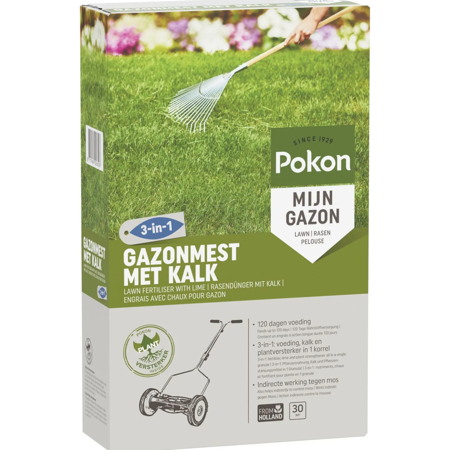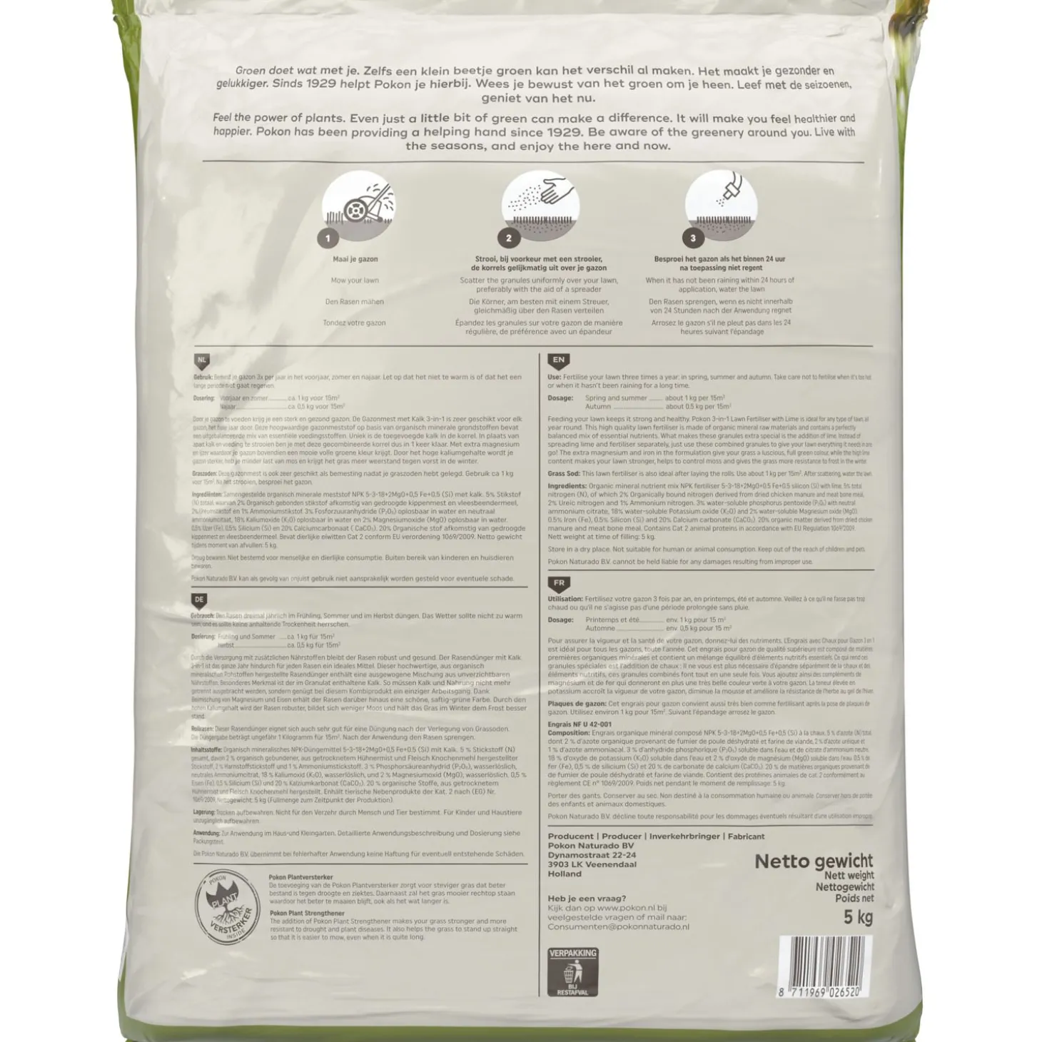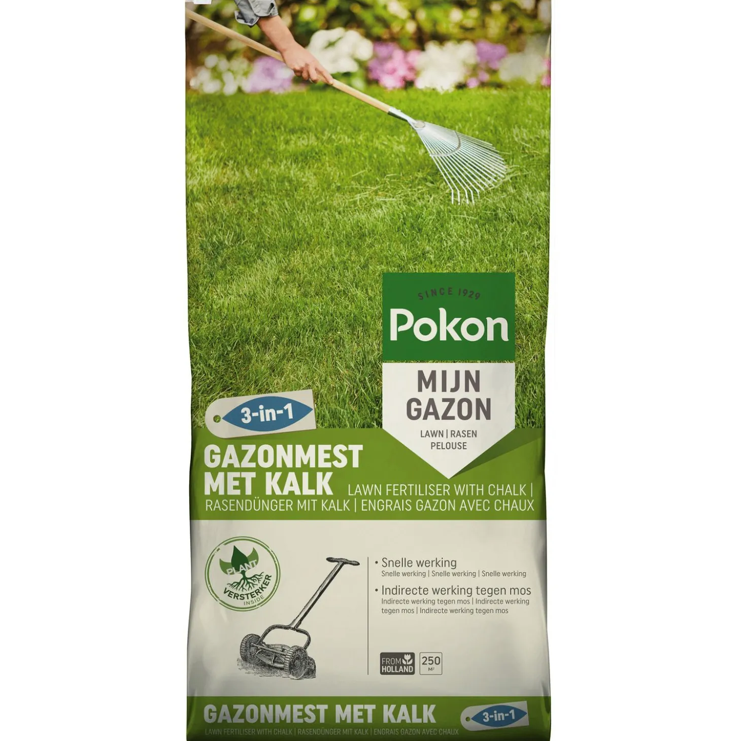 Een sterk en groen gazon krijg je niet zomaar. Het is belangrijk om je gazon te voorzien van de juiste voeding om zo een mooi, groen en dicht gazon te creëren. Maar ook kalk is belangrijk om voor een gezonde bodem te zorgen. Als laatste kan ook een Plantversterker handig zijn voor steviger gras dat bestand is tegen droogte en ziektes. Dit alles kan je in een handomdraai regelen met de Gazonmest met Kalk 3-in-1 van Pokon.