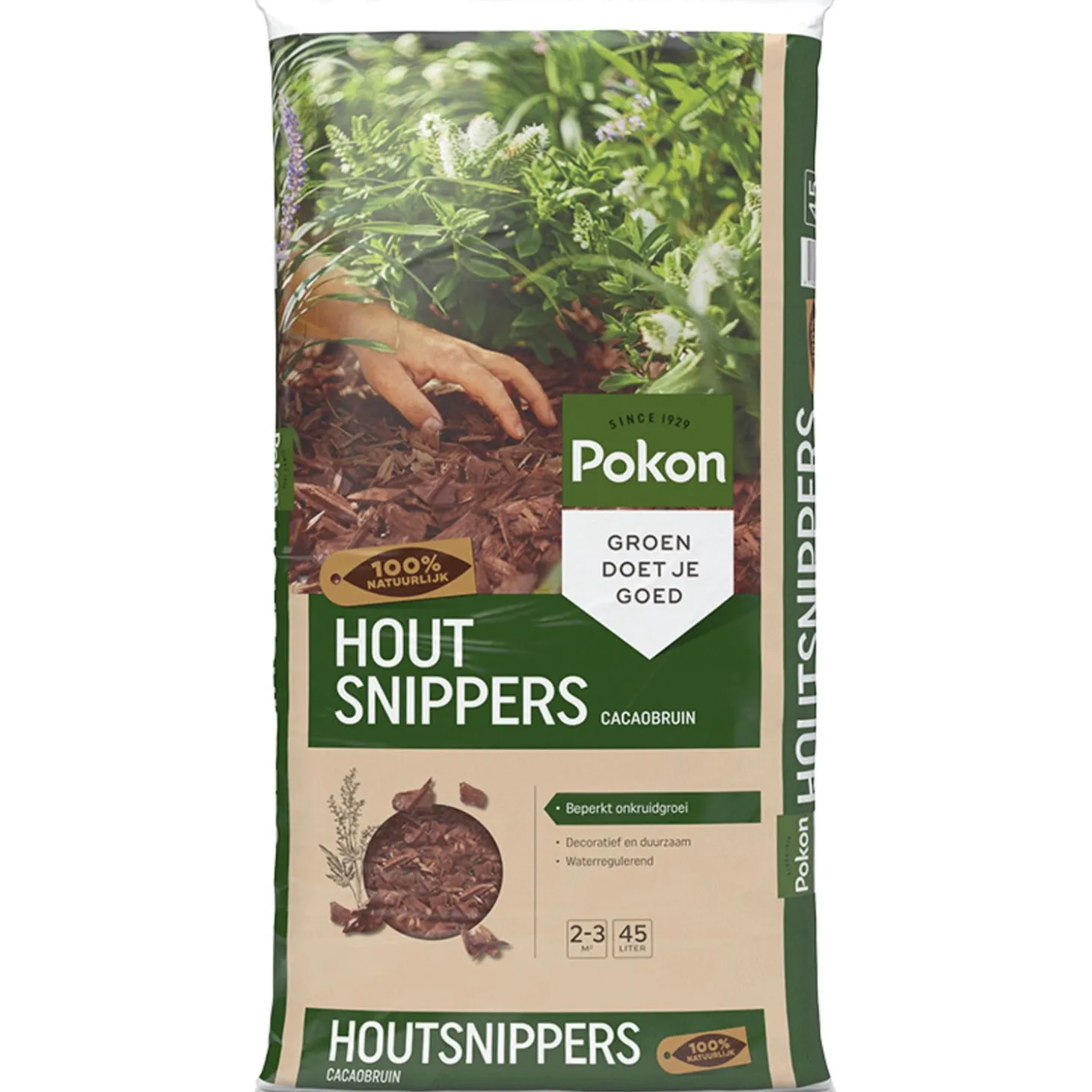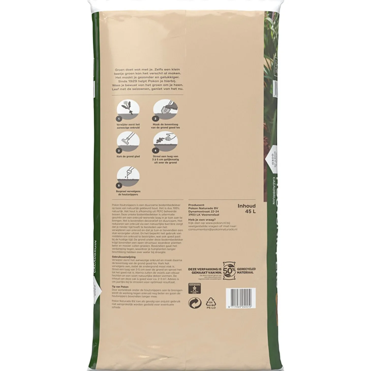 | Samenstelling | Pokon Houtsnippers Cacaobruin 45L is een decoratieve en duurzame bodembedekker op basis van natuurlijk gekleurd hout. Het hout is afkomstig uit PEFC beheerde bossen. Het is een 100% natuurlijk product. |