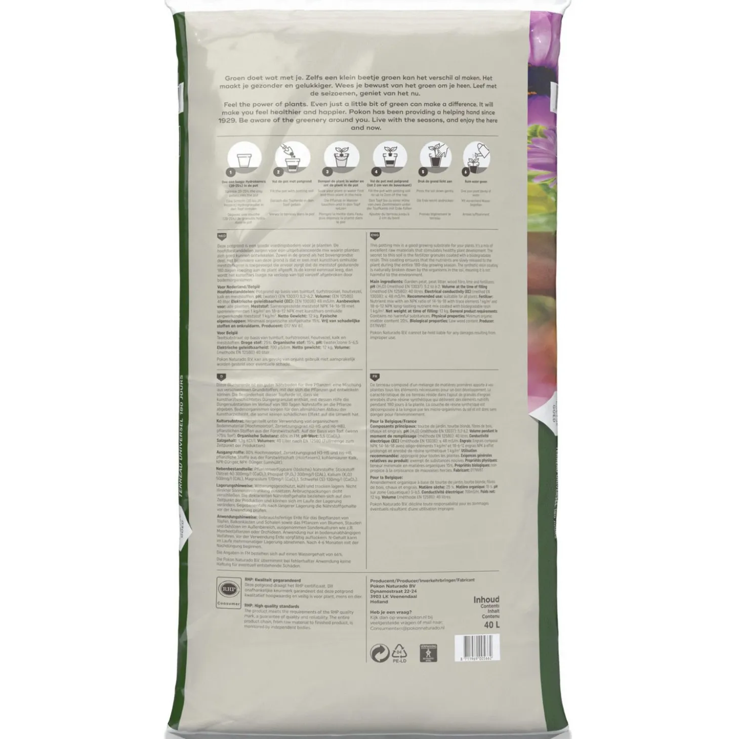 | Samenstelling | Deze potgrond bevat uitsluitend hoogwaardige, natuurlijke grondstoffen, zoals turfstrooisel, tuinturf, kalk en meststoffen. Hierdoor wordt water goed vastgehouden en nemen uw planten de voeding goed op. Bovendien is deze potgrond voorzien van langwerkende meststofkorrels met voeding voor 6 maanden. |