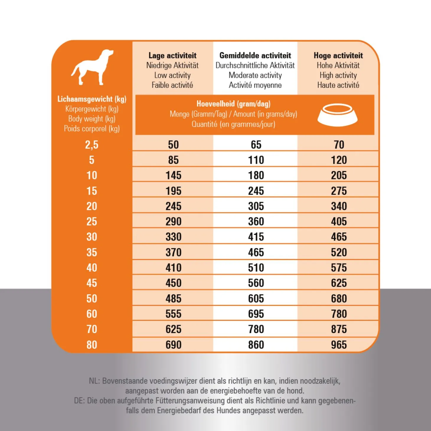 | Aanbeveling | Verdeel de dagelijkse portie voedsel over minimaal twee maaltijden per dag. Zorg dat er altijd voldoende vers water voor je hond klaar staat. Meng gedurende minimaal 7 dagen steeds meer nieuwe voeding door de oude voeding tot je geheel bent overgestapt. Bewaaradvies: koel en droog bewaren. Sluit de zak na gebruik goed af. |