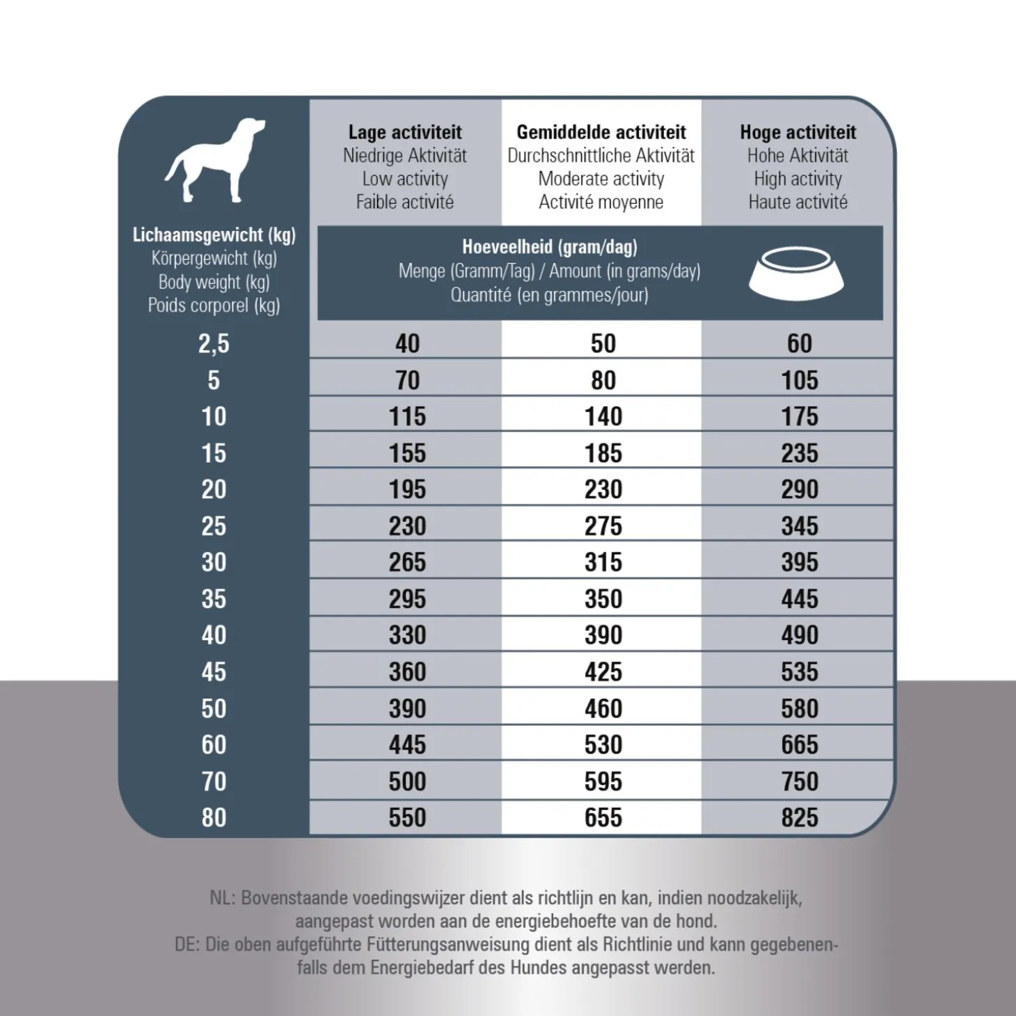 | Aanbeveling | Verdeel de dagelijkse portie voedsel over minimaal twee maaltijden per dag. Zorg dat er altijd voldoende vers water voor je hond klaar staat. Meng gedurende minimaal 7 dagen steeds meer nieuwe voeding door de oude voeding tot je geheel bent overgestapt. Bewaaradvies: koel en droog bewaren. Sluit de zak na gebruik goed af. |