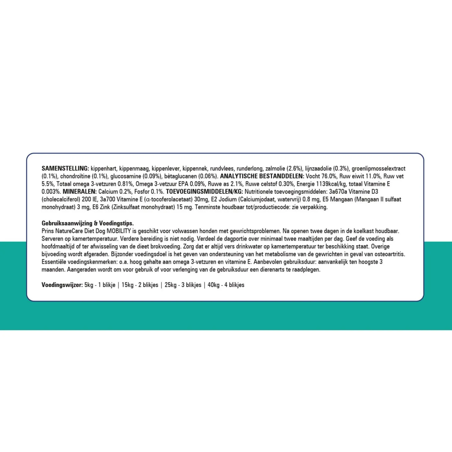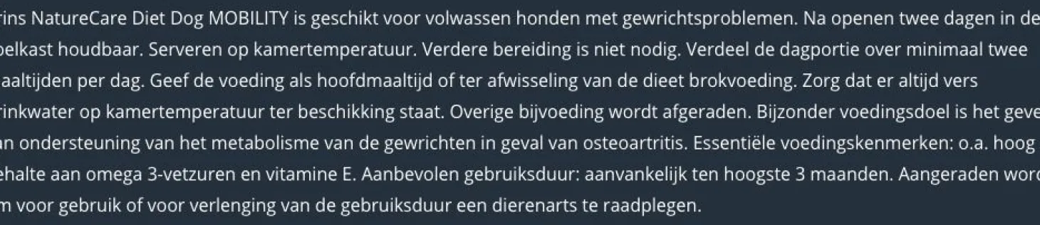 Het doel van deze natvoeding is het ondersteunen van het metabolisme en de gewrichten in geval van osteoartritis. Voer Mobility in principe ten hoogste 3 maanden. Raadpleeg voor gebruik of verlenging een dierenarts. Overige bijvoeding wordt afgeraden.