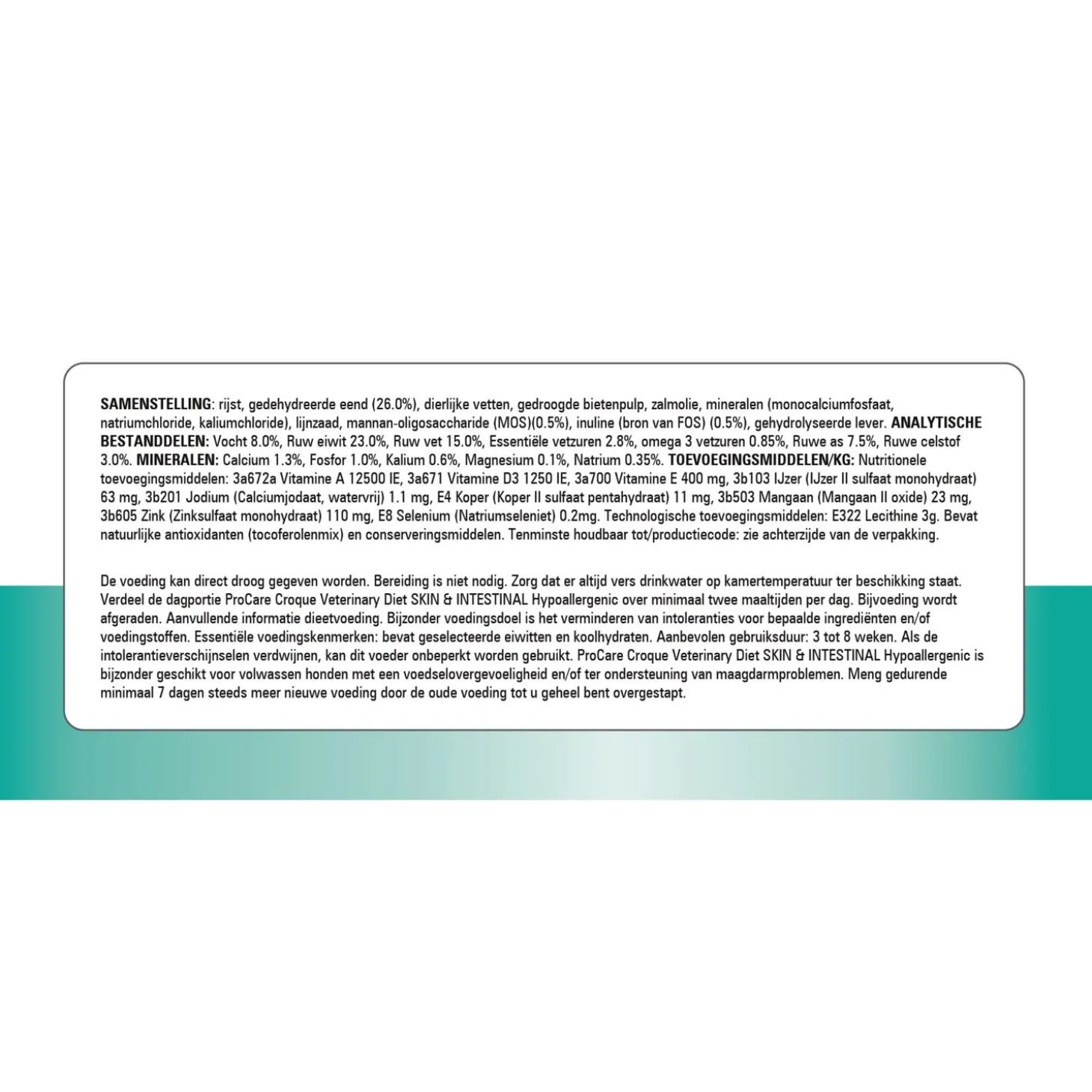 | Aanbeveling | ProCare Croque Veterinary Diet Skin Support kan droog worden gegeven. Bereiding is niet nodig. Verdeel de dagelijkse portie voeding over meerdere kleine maaltijden per dag. Overige bijvoeding wordt afgeraden. Hoog gehalte aan linolzuur (LA) en aan eicosapentaeenzuur (EPA) en docosahexaeenzuur (DHA) tezamen. Aanbevolen gebruiksduur, bij vermindering van intoleranties voor bepaalde ingrediënten en/of voedingsstoffen: 3 tot 8 weken, bij ondersteuning van de huidfunctie bij huidaandoening en overmatige haaruitval: aanvankelijk ten hoogste twee maanden. Als tekenen van intolerantie verdwijnen, kan deze voeding aanvankelijk tot één jaar worden gebruikt. Aangeraden wordt om vóór gebruik of vóór verlenging van de gebruiksduur een dierenarts te raadplegen. Na verlenging van de gebruiksperiode kan de voeding levenslang worden gegeven. Water moet altijd beschikbaar zijn. Ten minste houdbaar tot/productiecode: zie achterkant verpakking. Koel en droog bewaren. Sluit de zak na gebruik goed af. |