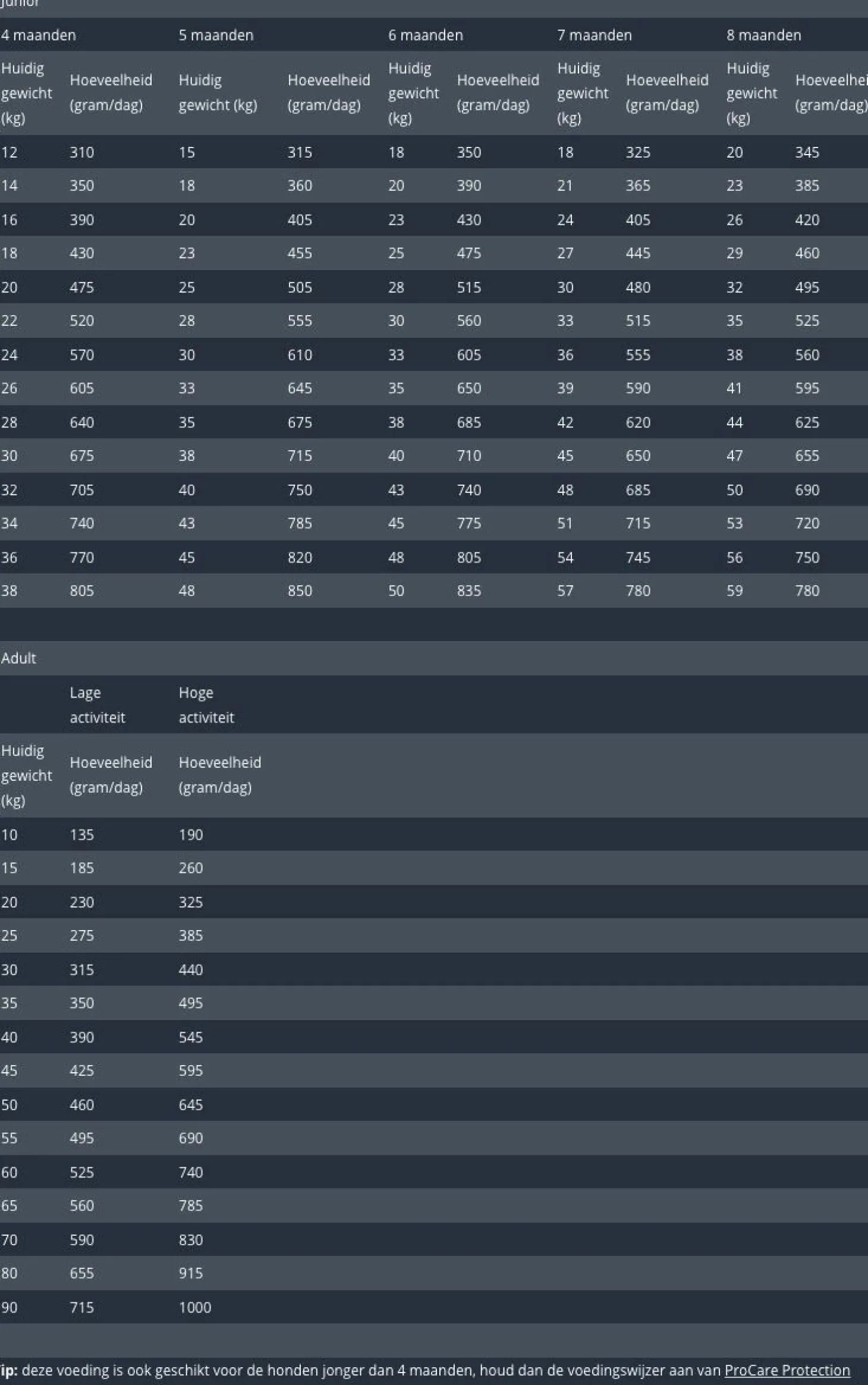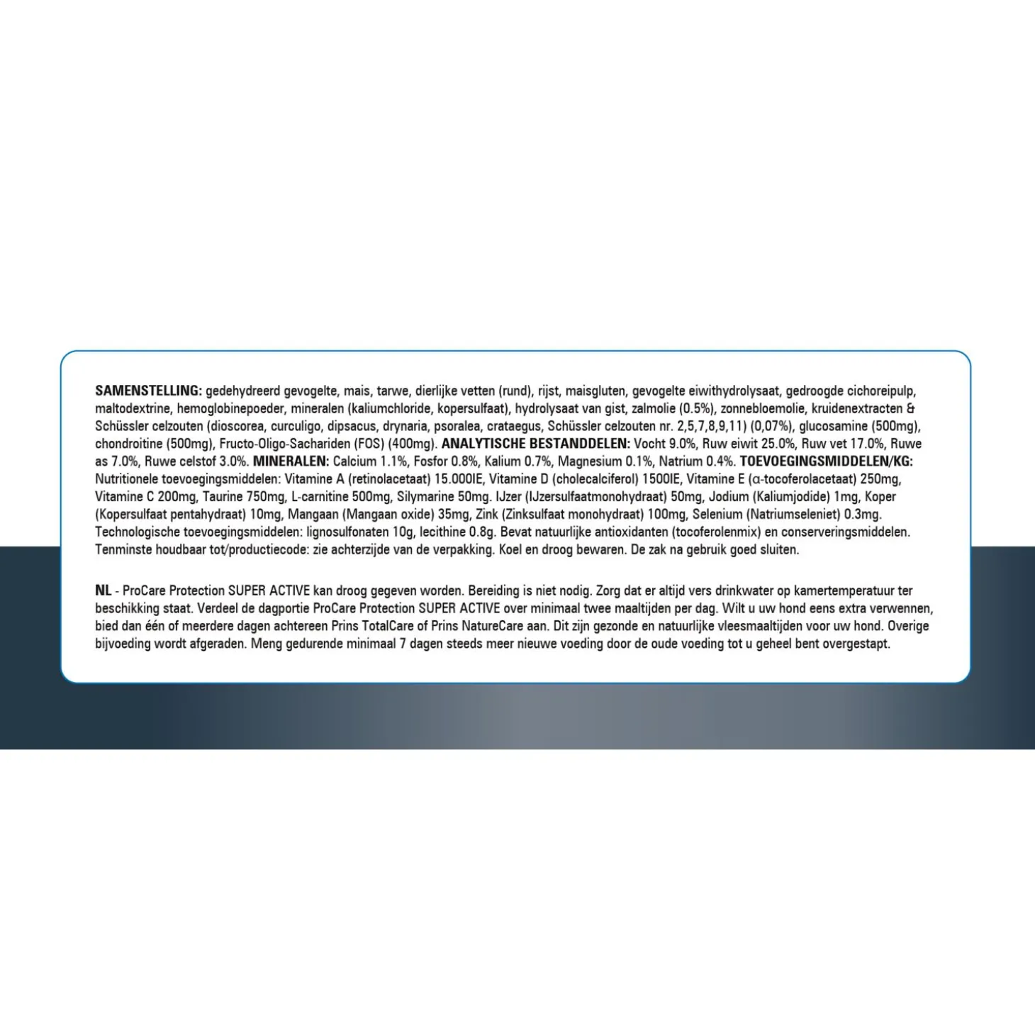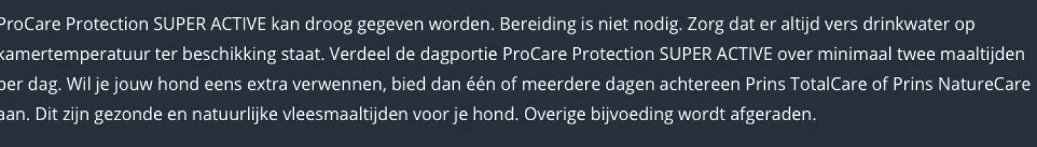 | Aanbeveling | ProCare Protection Super Active kan droog gegeven worden. Bereiding is niet nodig. Zorg dat er altijd vers drinkwater op kamertemperatuur ter beschikking staat. Verdeel de dagportie over minimaal twee maaltijden per dag. Meng gedurende minimaal 7 dagen steeds meer nieuwe voeding door de oude voeding tot u geheel bent overgestapt. Koel en droog bewaren. De zak na gebruik goed sluiten. |