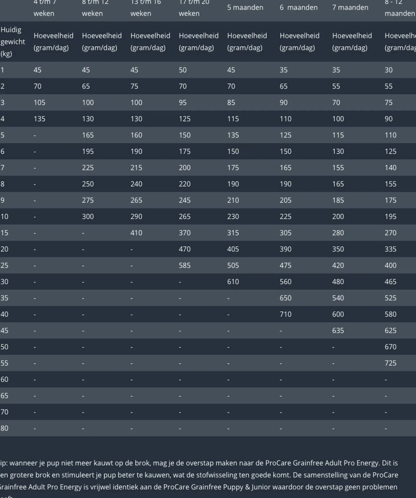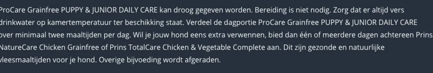 | Aanbeveling | ProCare Grainfree Puppy & Junior kan droog gegeven worden. Bereiding is niet nodig. Zorg dat er altijd vers drinkwater op kamertemperatuur ter beschikking staat. Verdeel de dagportie over minimaal twee maaltijden per dag. Overige bijvoeding wordt afgeraden. Meng gedurende minimaal 7 dagen steeds meer nieuwe voeding door de oude voeding tot je geheel bent overgestapt. Bewaar advies: koel en droog bewaren. Sluit de zak na gebruik goed af. |