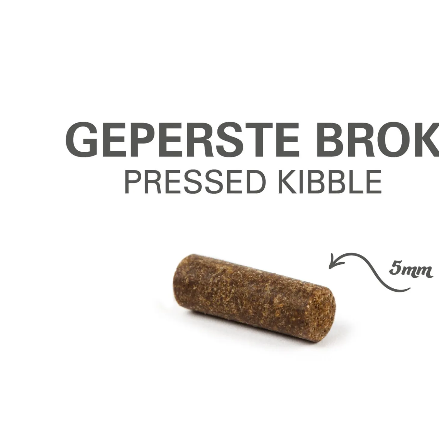 Puppy & Junior is een geperste brok, dat wil zeggen dat deze brokken zeer geconcentreerd zijn en daardoor minder volume in beslag nemen. Zo zijn de porties in vergelijking met krokante brok, een stuk kleiner. Dit zorgt voor een lagere maagbelasting. De brok wordt geperst bij een relatief lagere temperatuur, hierdoor gaan er minder voedingsstoffen verloren.