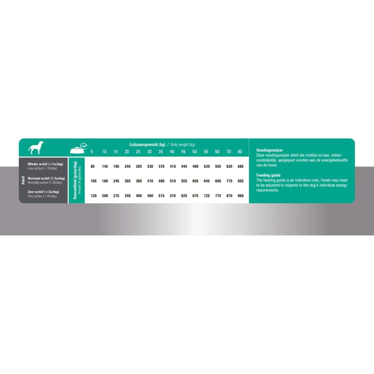 | Aanbeveling | Verdeel de dagelijkse portie voedsel over minimaal twee maaltijden per dag. Zorg dat er altijd voldoende vers water voor je hond klaar staat. Meng gedurende minimaal 7 dagen steeds meer nieuwe voeding door de oude voeding tot je geheel bent overgestapt. Bewaaradvies: koel en droog bewaren. Sluit de zak na gebruik goed af. |