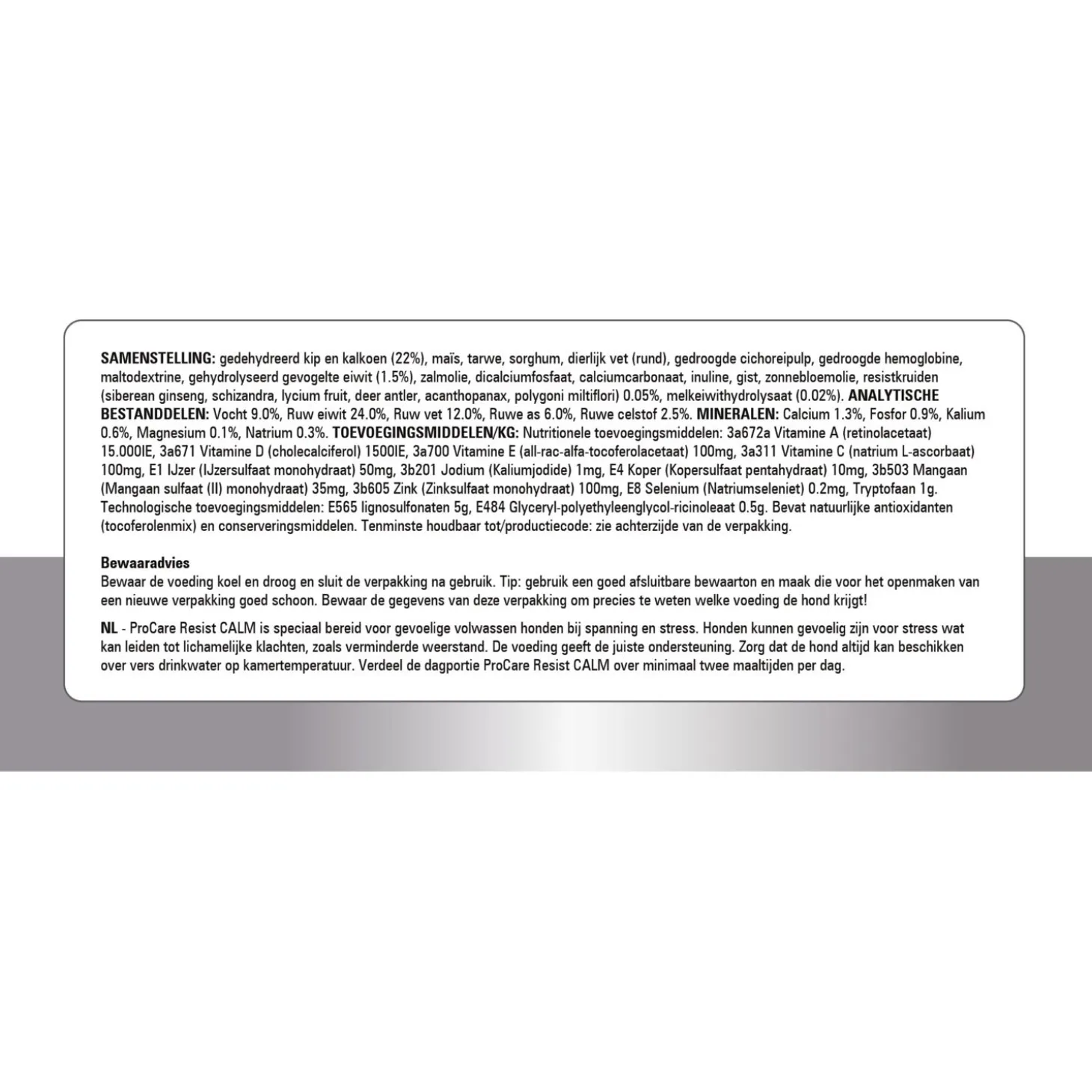 | Samenstelling | Samenstelling: gevogeltemeel (21,0%), maïs, tarwe, sorghum, gehydrolyseerd gevogelte eiwit (4,5%), rundvet, gedroogde cichoreipulp (2,0%), cellulose, kruidenmengsel (groene thee, passiebloem, kamille) (1,7%), zonnebloemolie, fructo-oligosachariden (FOS) (0,5%), algenolie (0,2%), gehydrolyseerde gist. |