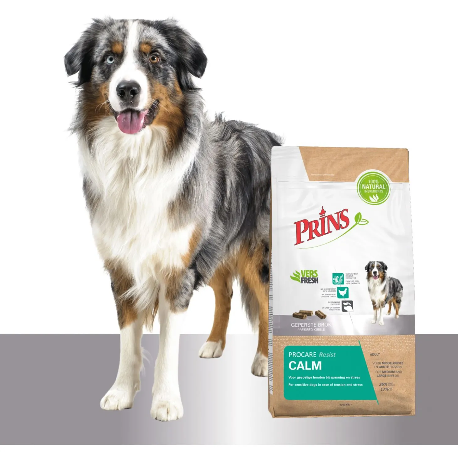 Sommige honden zijn gevoeliger voor zaken als angst en stress dan anderen. Prins ProCare Resist Calm is een 100% natuurlijke, geperste brokvoeding voor volwassen honden (ouder dan 18 maanden) van (middel)grote rassen die gevoelig zijn voor spanning en stress (voor kleine honden is er ProCare Mini).