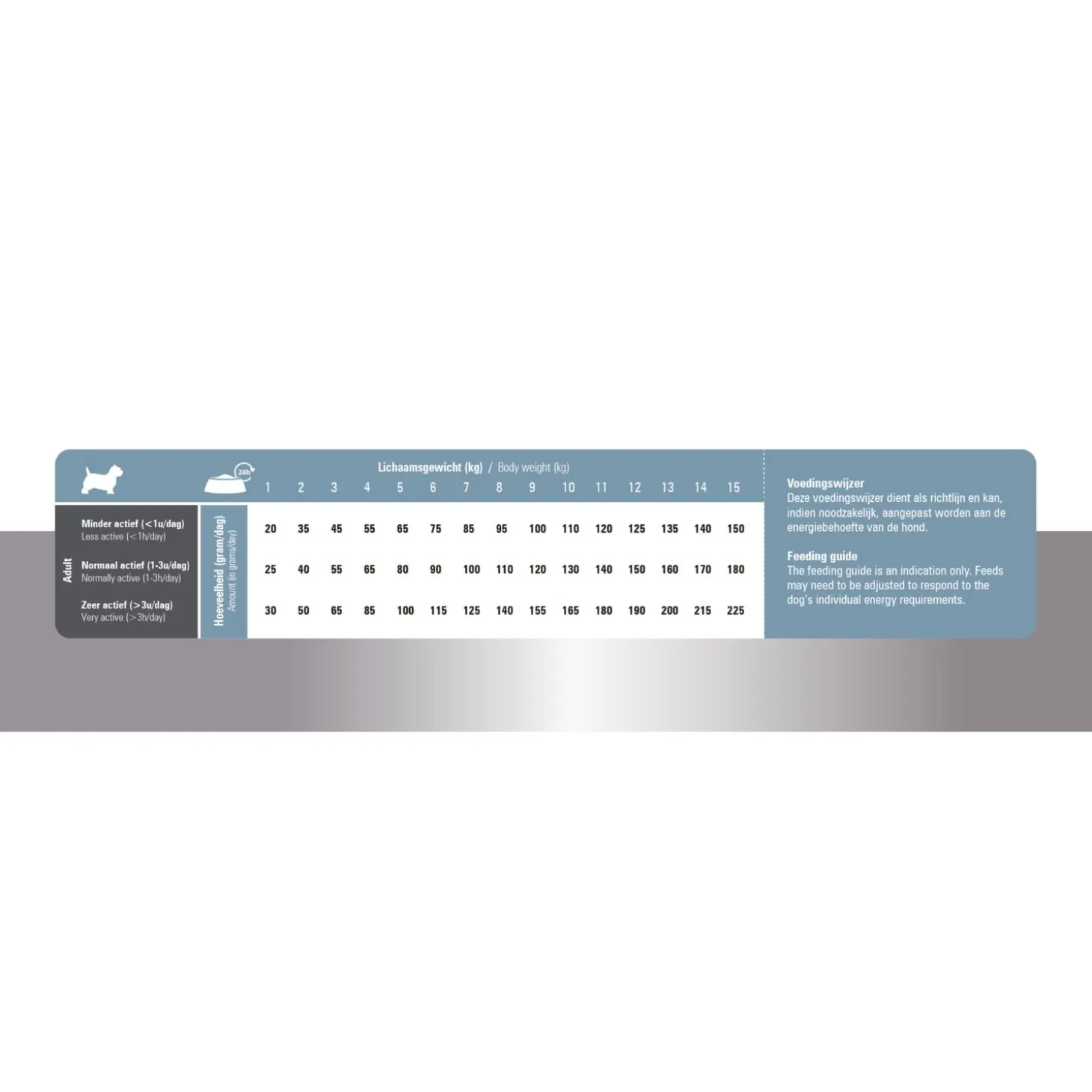 | Aanbeveling | Verdeel de dagelijkse portie voedsel over minimaal twee maaltijden per dag. Zorg dat er altijd voldoende vers water voor je hond klaar staat. Meng gedurende minimaal 7 dagen steeds meer nieuwe voeding door de oude voeding tot je geheel bent overgestapt. Bewaar advies: koel en droog bewaren. Sluit de zak na gebruik goed af. Ten minste houdbaar tot/productiecode: zie achterkant verpakking. |
