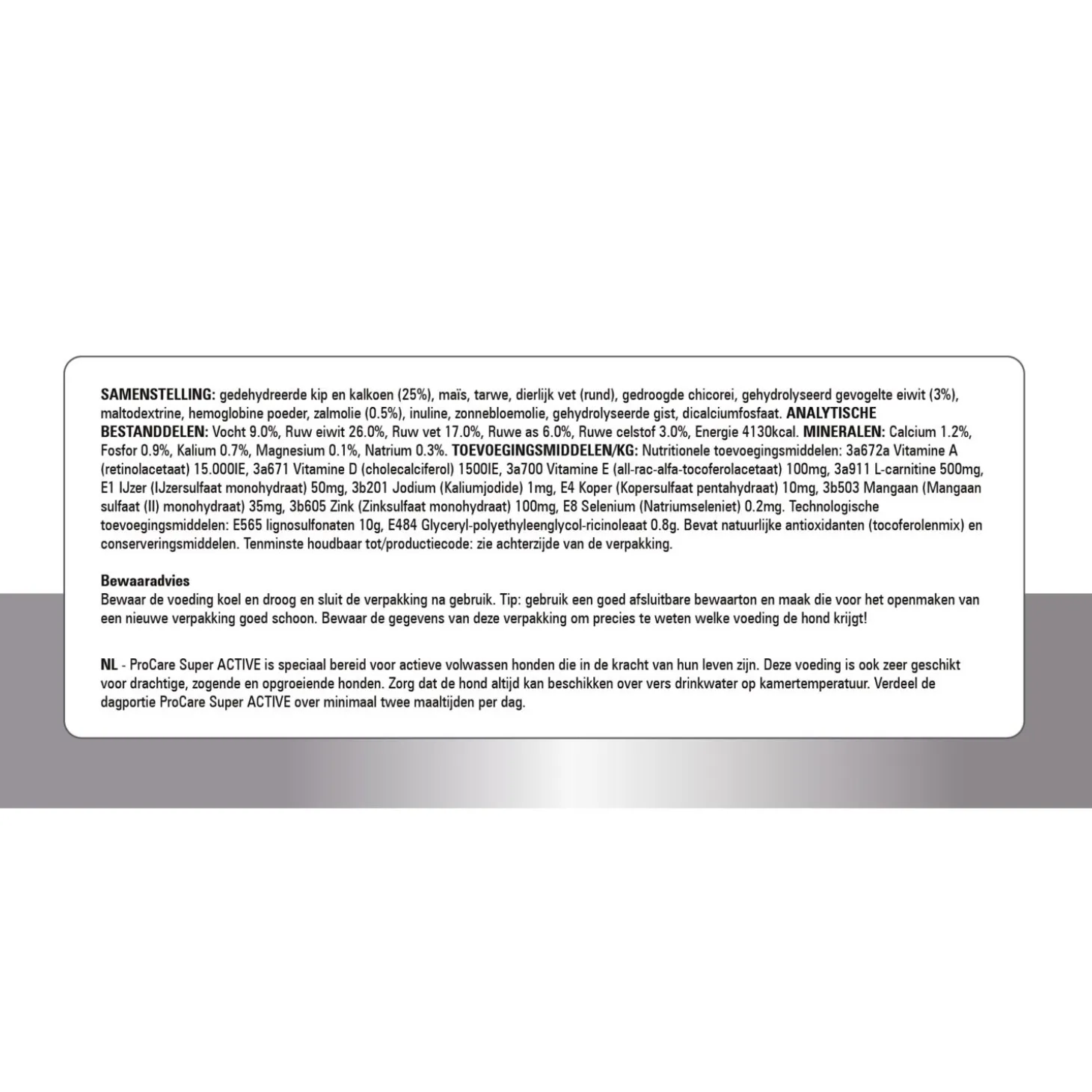 ProCare Super Active houdt je hond in goede conditie en zorgt voor een gezonde en glanzende huid en vacht. Essentiele vetzuren leveren voldoende energie voor jouw actieve hond. De hoge verteerbaarheid zorgt voor een optimale opname van alle voedingsstoffen. Zo blijft jouw hond actief en speels zoals u van hem gewend bent! De toevoeging van L-carnitine zorgt voor een optimale vetverbranding.