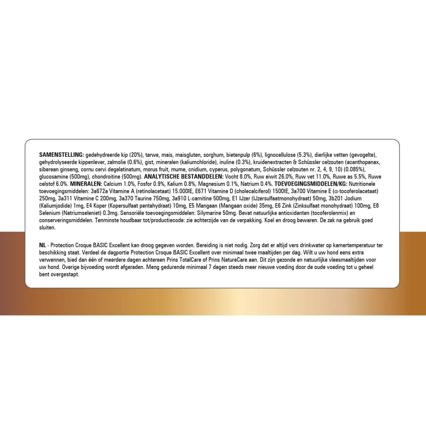 | Samenstelling | Samenstelling: Gedehydreerde kip (24%), tarwe, sorghum, mais, dierlijke vetten (gevogelte), maisgluten, bietenpulp, gehydrolyseerde kippenlever, lignocellulose, zalmolie (0.6%), gist, mineralen (kaliumchloride), inuline (0.3%), kruidenextracten & Schüssler celzouten (eleutherococci radix, mori fructus, dipsasci radix, dioscoreae oppositae rh, polygonati odorati rhi, cuscutae semen, curculiginis rhizoma, pruni mume fructus, ligustici wallichii rhiz, cyperi rhizoma, Schüssler celzouten nr. 1, 2, 5, 7) (0.085%), glucosamine (500mg), chondroitine (500mg). |