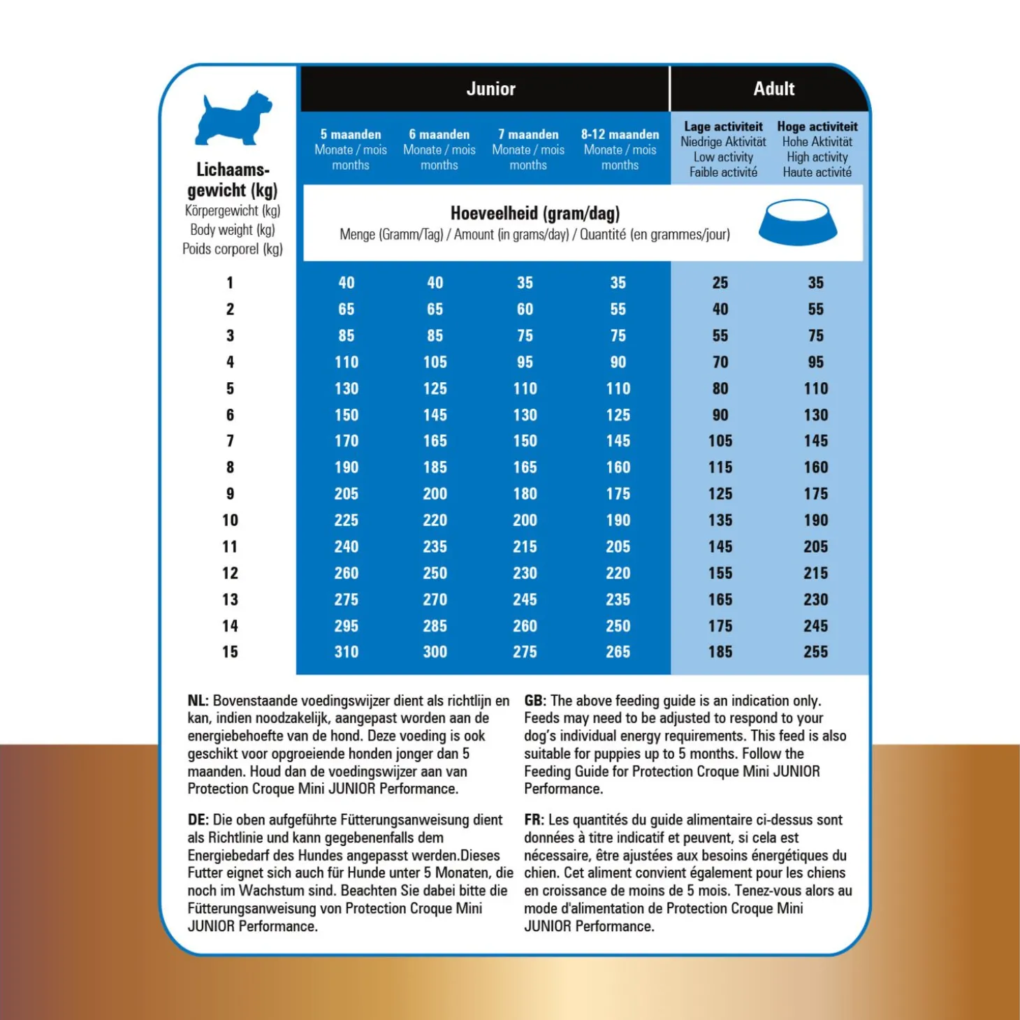 | Aanbeveling | Protection Croque Mini SUPER Performance kan droog gegeven worden. Bereiding is niet nodig. Zorg dat er altijd vers drinkwater op kamertemperatuur ter beschikking staat. Verdeel de dagportie over minimaal twee maaltijden per dag. Meng gedurende minimaal 7 dagen steeds meer nieuwe voeding door de oude voeding tot jegeheel bent overgestapt. |