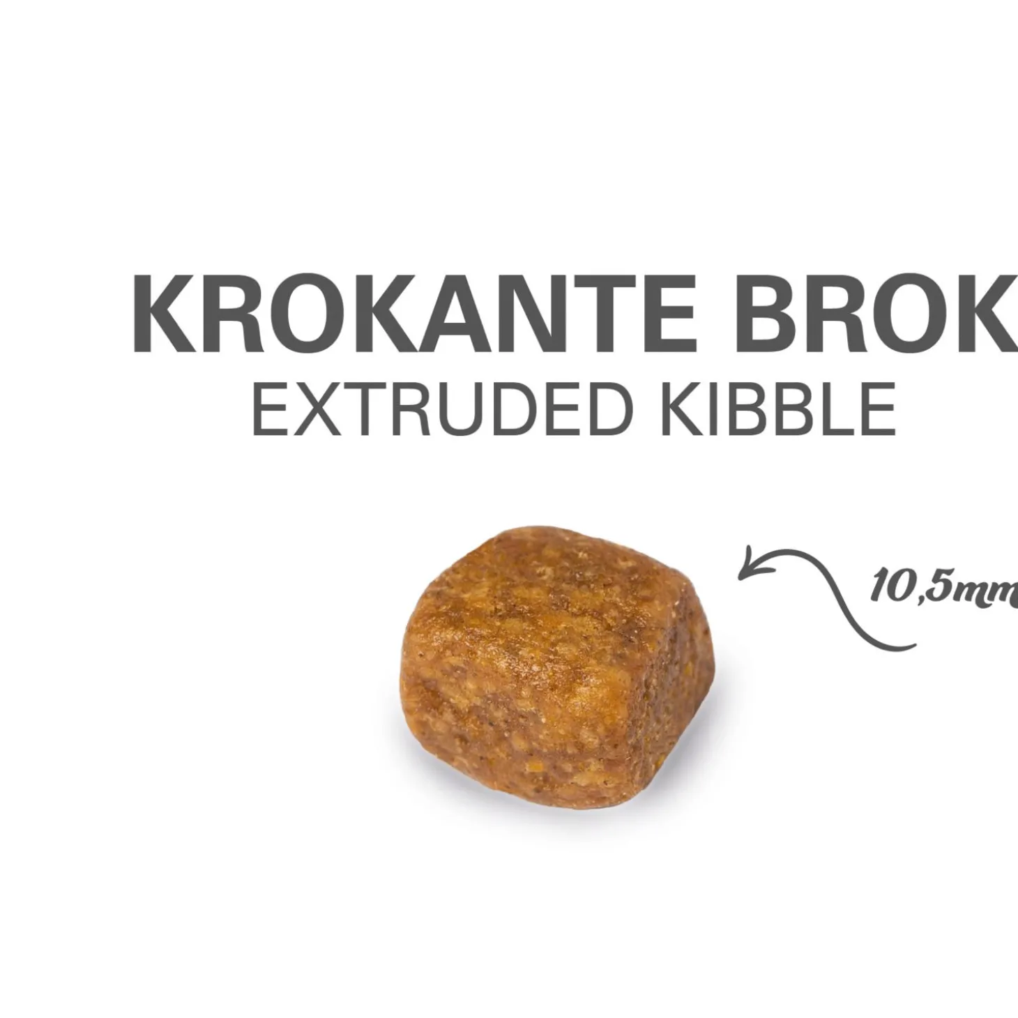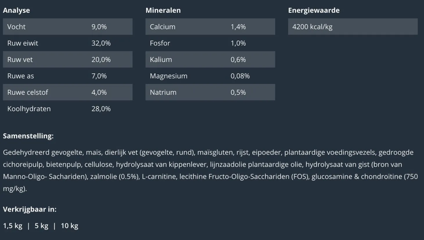 | Samenstelling | Samenstelling: gedehydreerd gevogelte (30,0%), maïs, maïsgluten, gevogeltevet, rundvet, rijst, heel eipoeder (3,0%), gedroogde cichoreipulp, cellulose, kippenleverhydrolysaat, lijnzaadolie, gist, visolie (0,5%), inuline, glucosamine en chondroïtine (0,075%). |