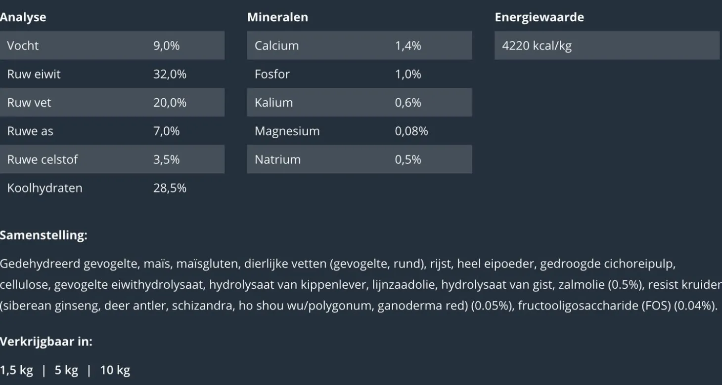 | Samenstelling | Gedehydreerd gevogelte, maïs, maïsgluten, dierlijke vetten (gevogelte, rund), rijst, heel eipoeder, gedroogde cichoreipulp, cellulose, gevogelte eiwithydrolysaat, hydrolysaat van kippenlever, lijnzaadolie, hydrolysaat van gist, zalmolie (0.5%), resist kruiden (siberean ginseng, deer antler, schizandra, ho shou wu/polygonum, ganoderma red) (0.05%), fructooligosaccharide (FOS) (0.04%) |