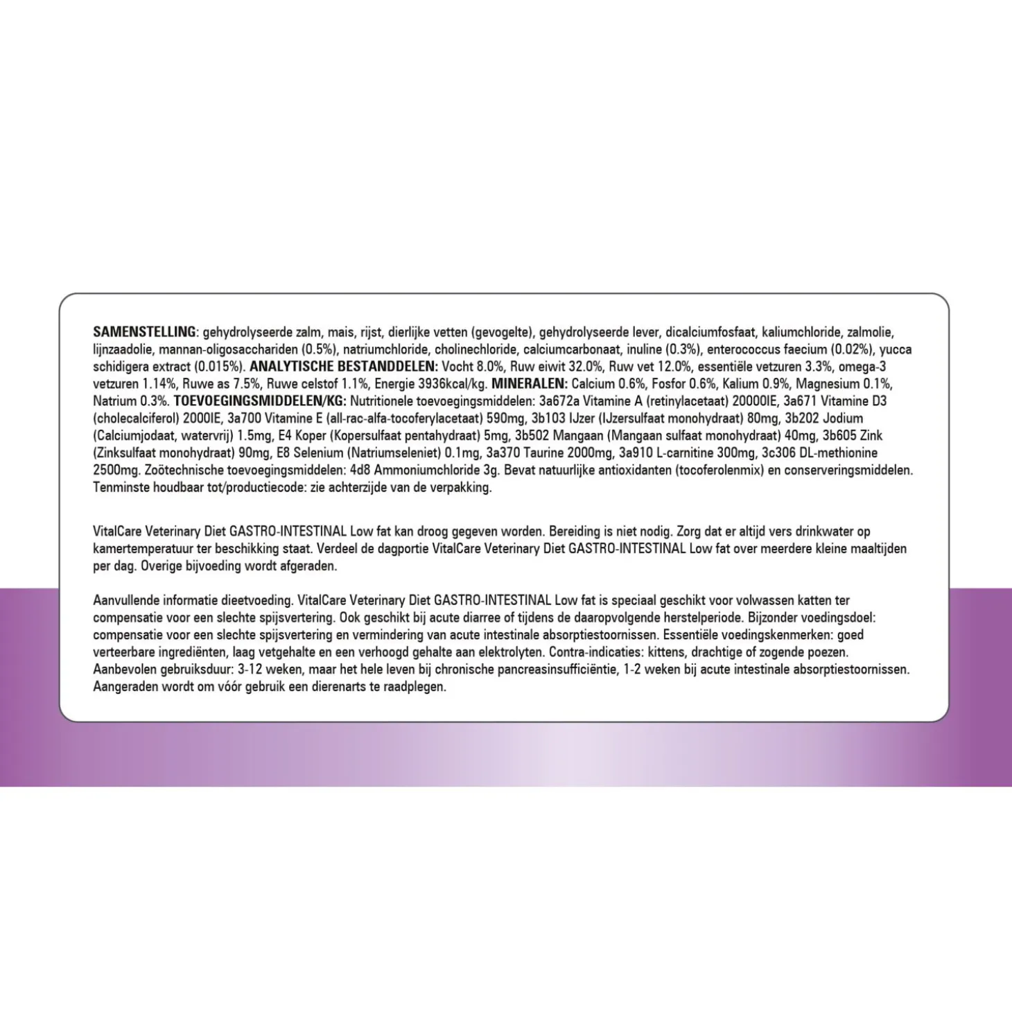 | Aanbeveling | VitalCare Veterinary Diet Gastro-Intestinal Low fat kan droog gegeven worden. Bereiding is niet nodig. Zorg dat er altijd vers drinkwater op kamertemperatuur ter beschikking staat. Verdeel de dagportie VitalCare Veterinary Diet Gastro-Intestinal Low fat over meerdere kleine maaltijden per dag. Overige bijvoeding wordt afgeraden. Aanvullende informatie dieetvoeding. VitalCare Veterinary Diet Gastro-Intestinal Low fat is speciaal geschikt voor volwassen katten ter compensatie voor een slechte spijsvertering. Ook geschikt bij acute diarree of tijdens de daaropvolgende herstelperiode. Bijzonder voedingsdoel: compensatie voor een slechte spijsvertering en vermindering van acute intestinale absorptiestoornissen. Essentiële voedingskenmerken: goed verteerbare ingrediënten, laag vetgehalte en een verhoogd gehalte aan elektrolyten. Contra-indicaties: kittens, drachtige of zogende poezen. Aanbevolen gebruiksduur: 3-12 weken, maar het hele leven bij chronische pancreasinsufficiëntie, 1-2 weken bij acute intestinale absorptiestoornissen. Aangeraden wordt om vóór gebruik een dierenarts te raadplegen. |