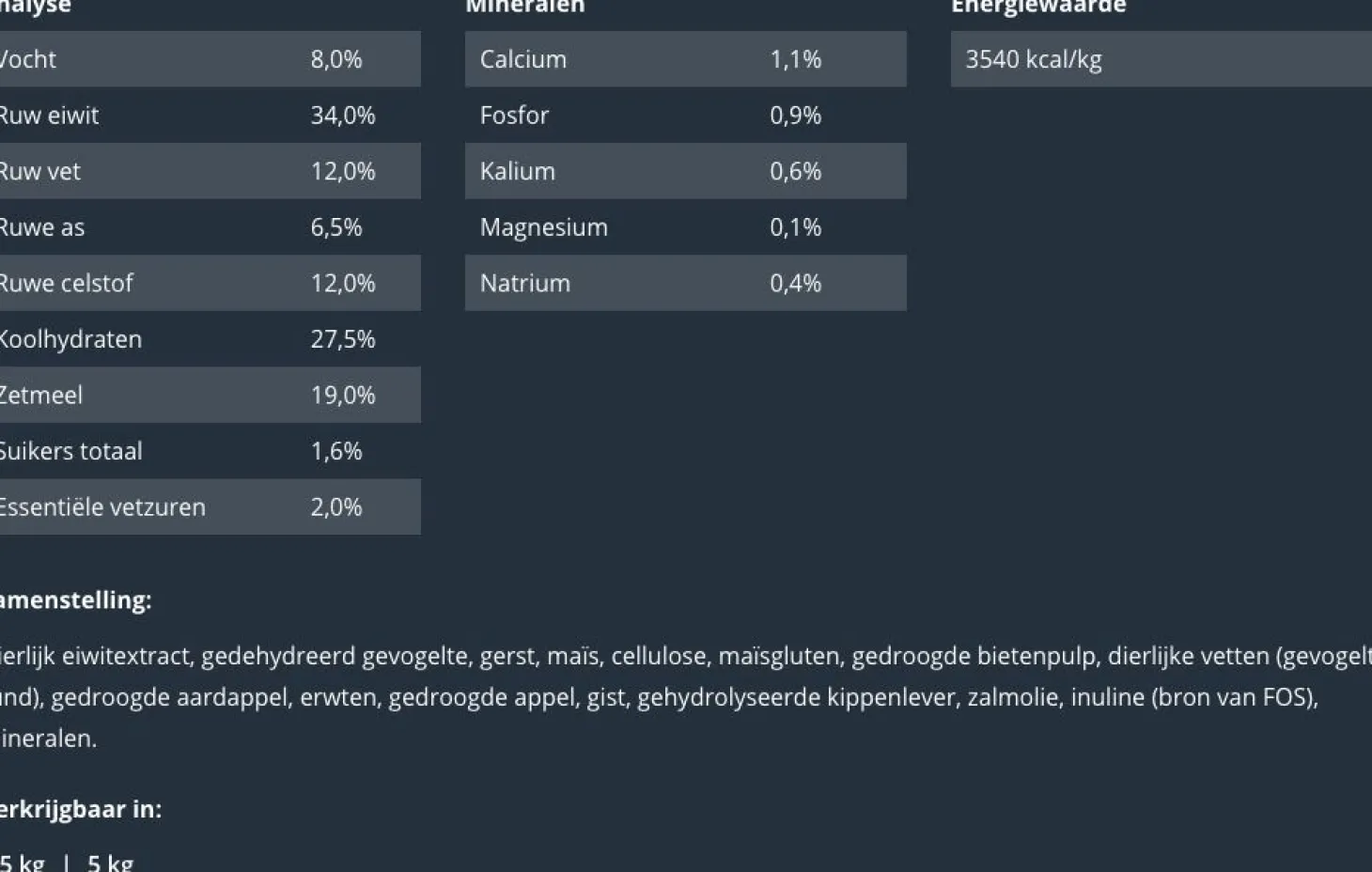 | Analyse | Analytische bestanddelen: Vocht 8,0%, Ruw eiwit 34,0%, Ruw vet 12,0%, Essentiële vetzuren 2,0%, Zetmeel 19,0%, Suikers totaal 1,6%, Overige koolhydraten 27,5%, Ruwe as 6,5%, Ruwe celstof 12,0%, Energie 3290 kcal/kg. Mineralen: Calcium 1,1%, Fosfor 0,9%, Kalium 0,6%, Magnesium 0,1%, Natrium 0,4% |