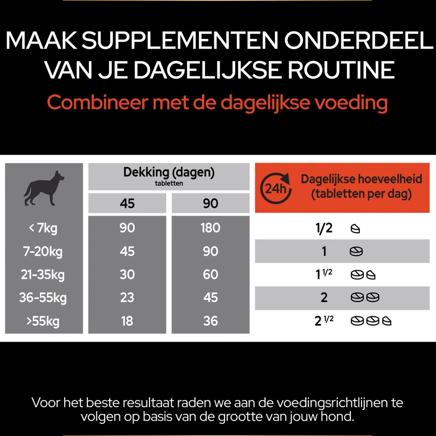 | Gewicht van de hond | Dekking (dagen) | Aanbevolen dagelijkse hoeveelheid tabletten |