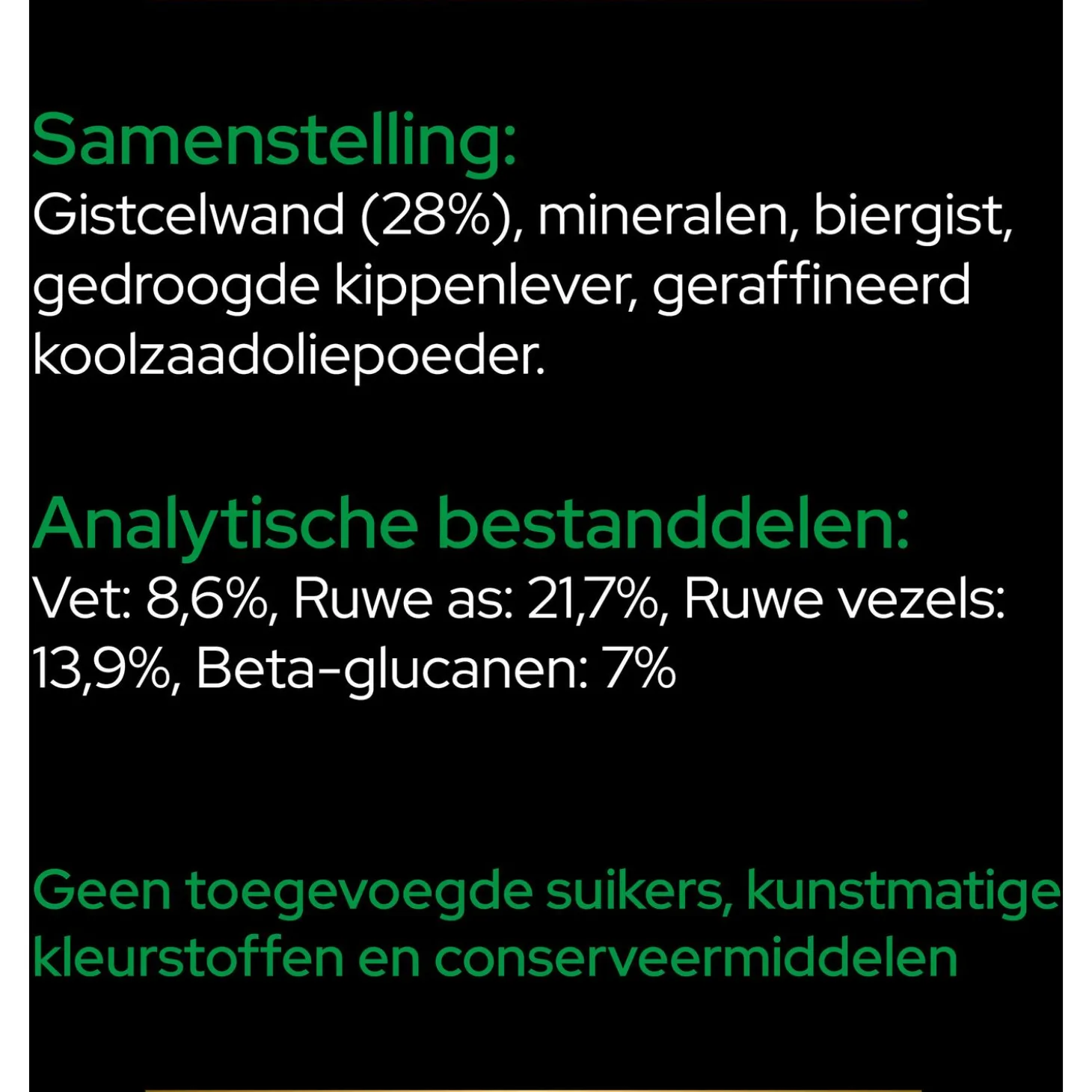 | Samenstelling | Gistcelwand (28%), mineralen, biergist, gedroogde kippenlever, geraffineerd koolzaadoliepoeder, gist celwand, een bron van beta-glucanen om de natuurlijke afweer te helpen versterken. |