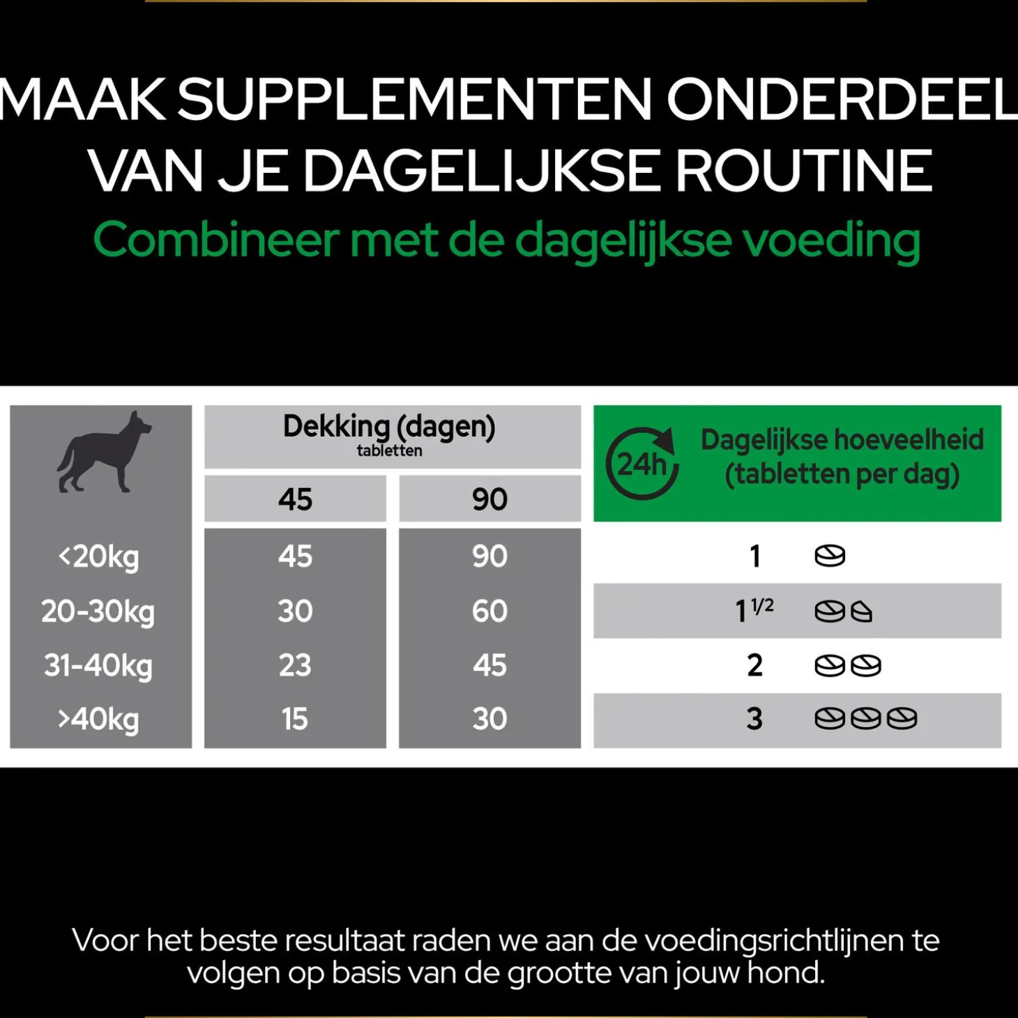 Geef één tablet per dag, bij voorkeur tijdens een van de maaltijden van jouw hond. Plaats het Pro Plan Natural Defences+ tablet in de voerbak of reik het rechtstreeks aan jouw hond aan. Voor optimale resultaten is het belangrijk om dit supplement regelmatig als onderdeel van de dagelijkse voeding te blijven geven.