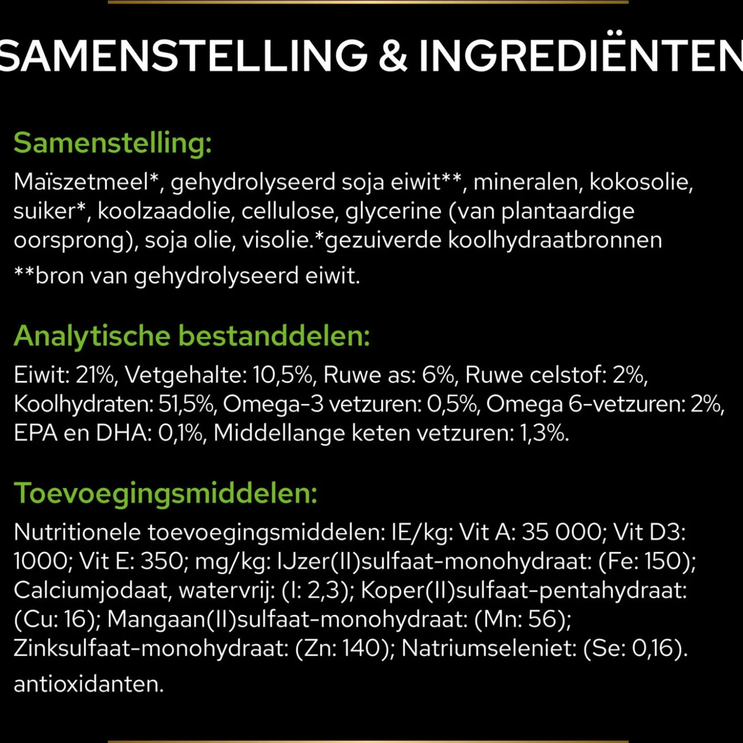 | Samenstelling | Maiszetmeel*, gehydrolyseerd soja-eiwit**, mineralen, kokosolie, suiker*, raapzaadolie, cellulose, sojaolie, visolie.* Gezuiverde koolhydraatbronnen.** Eiwitbron. |