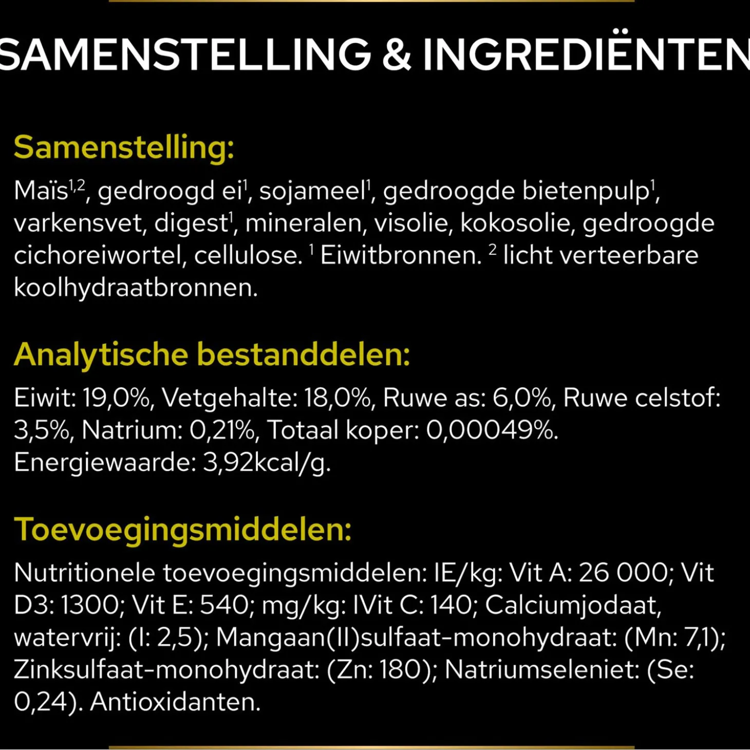| Samenstelling | Mais*,**, gedroogd ei*, sojameel*, gedroogde bietenpulp*, dierlijk vet, digest*, mineralen, kokosolie, gedroogde cichoreiwortel, visolie, cellulose.* Bron van eiwitten.** Zeer goed verteerbare koolhydraatbronnen. |