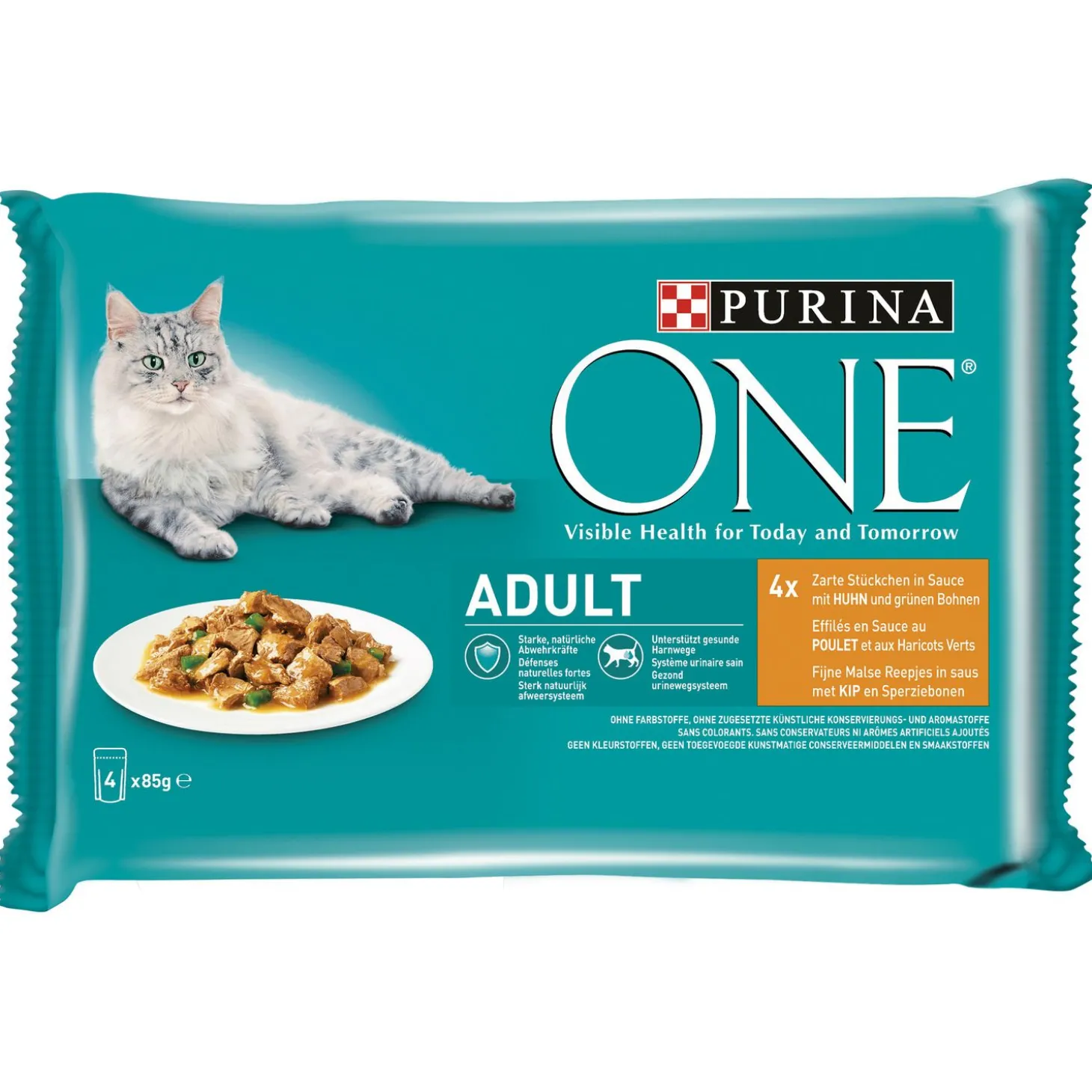 | Samenstelling | Samenstelling: Vlees en dierlijke bijproducten (waarvan 4% kip), plantaardige eiwitextracten, vis en visbijproducten, mineralen, plantaardige bijproducten, oliën en vetten, groenten (0,6% gedehydreerde sperziebonen, gelijkwaardig aan 5,4% sperziebonen), suiker. |