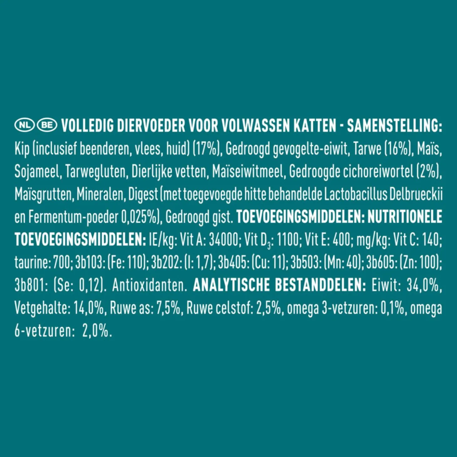 | Samenstelling | Samenstelling: Kip (inclusiefbot, vlees, huid) (17%), Gedroogd gevogelte-eiwit, Tarwe (16%), Maïs, Sojameel, Tarwegluten, Dierlijke vetten, Maïseiwitmeel, Gedroogde cichoreiwortel (2%), Maïsgrutten, Mineralen, Digest (met toegevoegde hitte behandelde Lactobacillus Delbrueckii en Fermentum-poeder 0,025%), Gedroogd gist. |