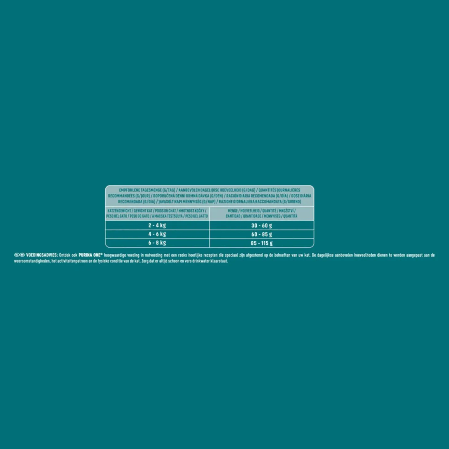 | Aanbeveling | Voedingsadvies: Aanbevolen dagelijkse hoeveelheid (g/dag)Ontdek ook Purina ONE hoogwaardige voeding in natte producten met een reeks heerlijke recepten die speciaal zijn afgestemd op de specifieke behoeften van jouw kat.De aanbevolen dagelijkse hoeveelheden moeten indien nodig worden aangepast aan de weersomstandigheden, de mate van activiteit en de fysieke conditie van de kat. Schoon en vers drinkwater dient altijd beschikbaar te zijn.Gewicht kat Hoeveelheid2 – 4 kg 30 – 60 g4 – 6 kg 60 – 85 g6 – 8 kg 85 – 115 g |