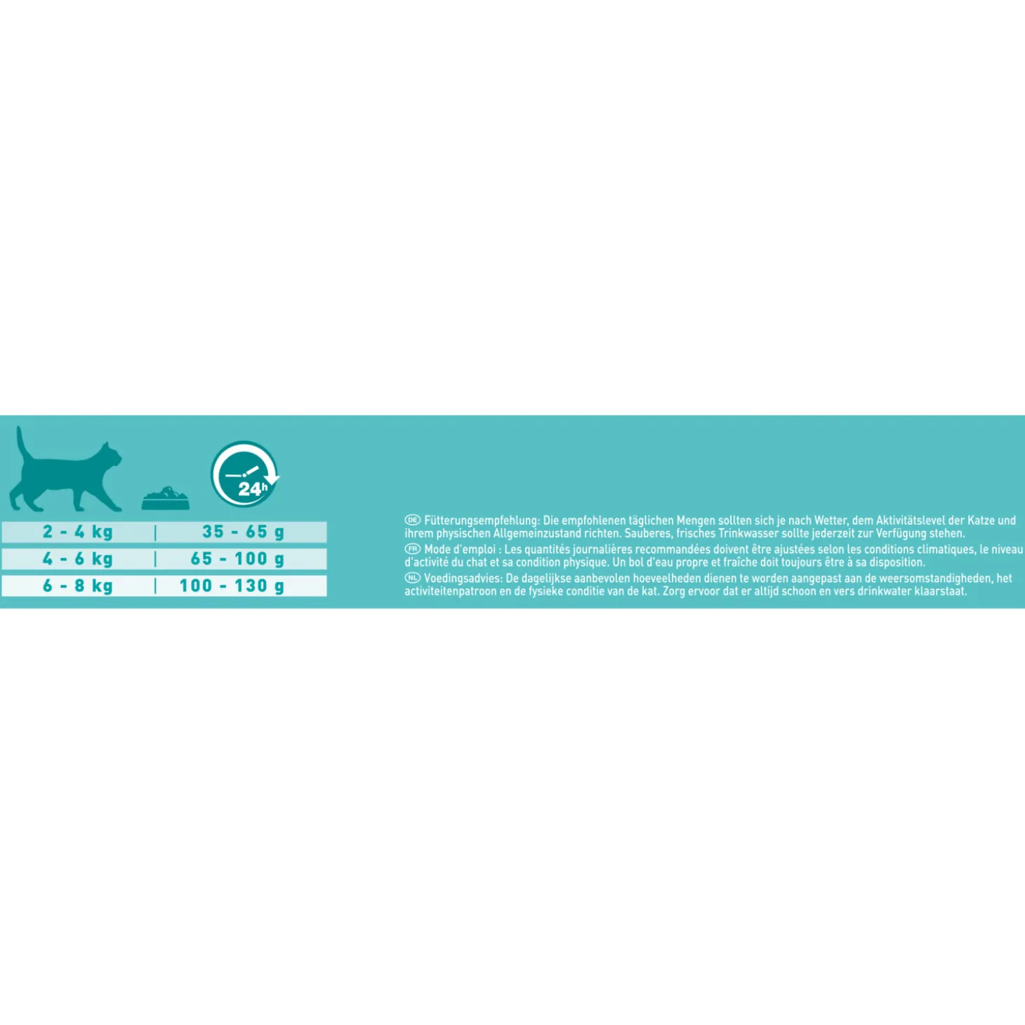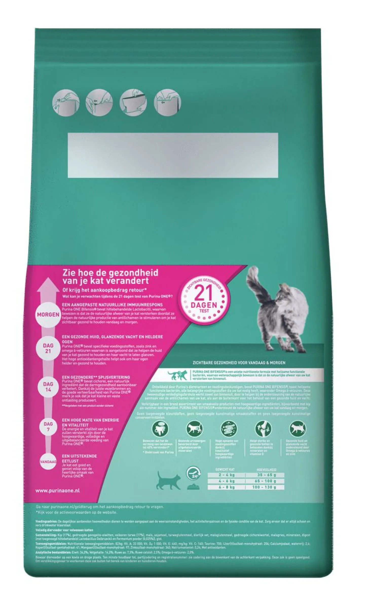| Aanbeveling | Voedingsadvies: Ontdek ook Purina ONE hoogwaardige voeding in natte producten met een reeks heerlijke recepten die speciaal zijn afgestemd op de specifieke behoeften van jouw kat. De aanbevolen dagelijkse hoeveelheden moeten indien nodig worden aangepast aan de weersomstandigheden, de mate van activiteit en de fysieke conditie van de kat. Schoon en vers drinkwater dient altijd beschikbaar te zijn. |