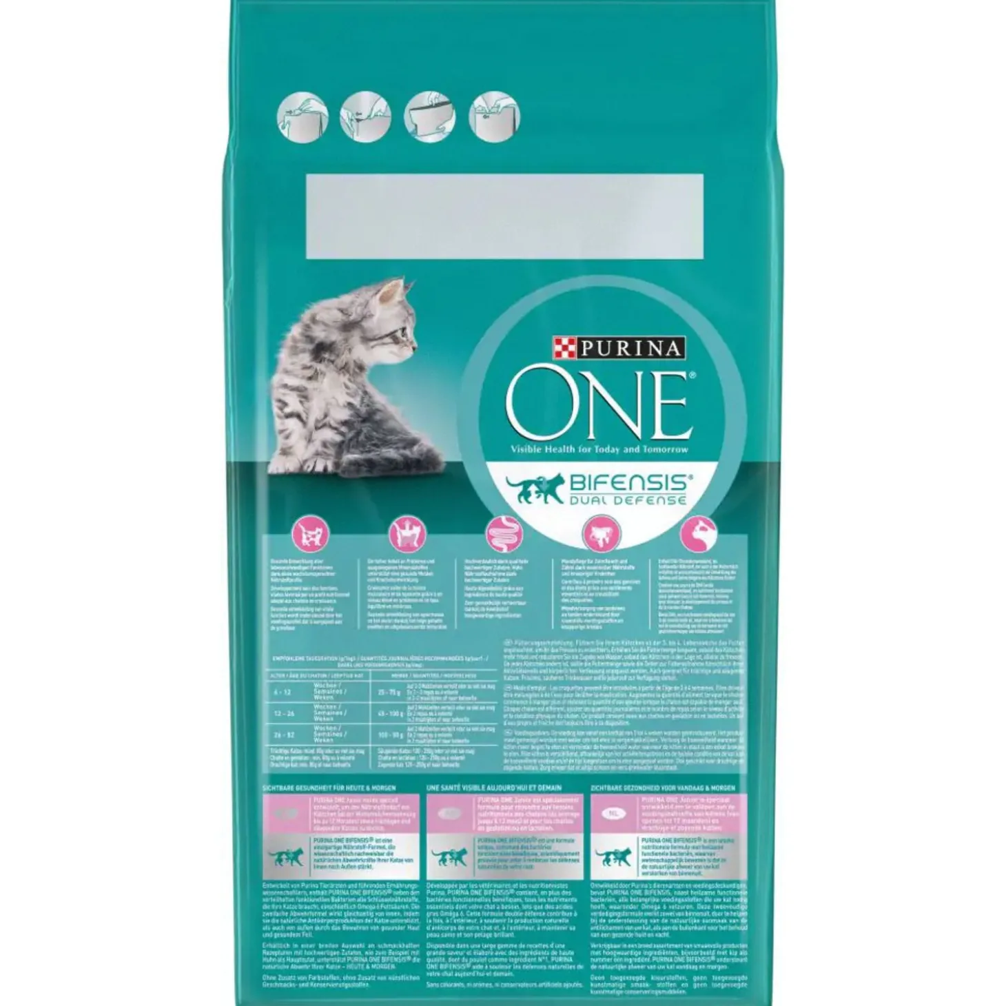 | Aanbeveling | Kittens Leeftijd (weken) Hoeveelheid / dag(g)6-12 weken 50 – 6512-26 weken 65 – 7526-52 weken 75 – 70Voedingsadvies:Aanbevolen dagelijkse hoeveelheid (g/dag)Dit product zou geïntroduceerd moeten worden op een leeftijd van 3 tot 4 weken. Product moet worden gemengd met water om het eten gemakkelijker te maken. Verhoog de hoeveelheid naarmate de kitten meer begint te eten en verminder de hoeveelheid water die wordt toegevoegd wanneer de kitten het voer alleen kan eten. Elke kitten is anders, afhankelijk van het activiteitenniveau en de lichaamsconditie van de kitten, moeten de hoeveelheden voer en/of de tijd om te eten mogelijk worden aangepast. Verhoog geleidelijk de hoeveelheid voedsel die tijdens de dracht/lactatie wordt gegeven.Zorg ervoor dat er altijd vers drinkwater klaarstaat.Ontdek ook Purina ONE hoogwaardige voeding in natte producten met een reeks heerlijke recepten die speciaal zijn afgestemd op de specifieke behoeften van jouw kat. |