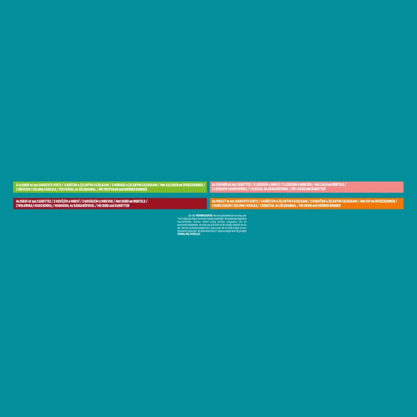 | Samenstelling | Samenstelling:Vlees en dierlijke bijproducten (waarvan rund 4%), Plantaardige eiwitextracten, Vis en visbijproducten, Plantaardige bijproducten, Oliën en vetten, Mineralen, Suiker, Groenten (0,6% gedehydreerde wortelen, gelijkwaardig aan 5,4% wortelen).Samenstelling:Vlees en dierlijke bijproducten (waarvan kalkoen 4%), Plantaardige eiwitextracten, Vis en visbijproducten, Plantaardige bijproducten, Oliën en vetten, Mineralen, Groenten (0,6% gedehydreerde sperziebonen, gelijk aan 5,4% sperziebonen), Suiker.Samenstelling:Vlees en dierlijke bijproducten (waarvan kip 5%), Plantaardige eiwitextracten, Vis en visbijproducten, Plantaardige bijproducten, Oliën en vetten, Mineralen, Groenten (0,6% gedehydreerde sperziebonen, gelijk aan 5,4% sperziebonen), Suiker.Samenstelling:Vlees en dierlijke bijproducten, Plantaardige eiwitextracten, Vis en visbijproducten (zalm 4%), Plantaardige bijproducten, Oliën en vetten, Mineralen, Groenten (0,6% gedehydreerde wortelen, gelijkwaardig aan 5,4% wortelen), Suiker. |