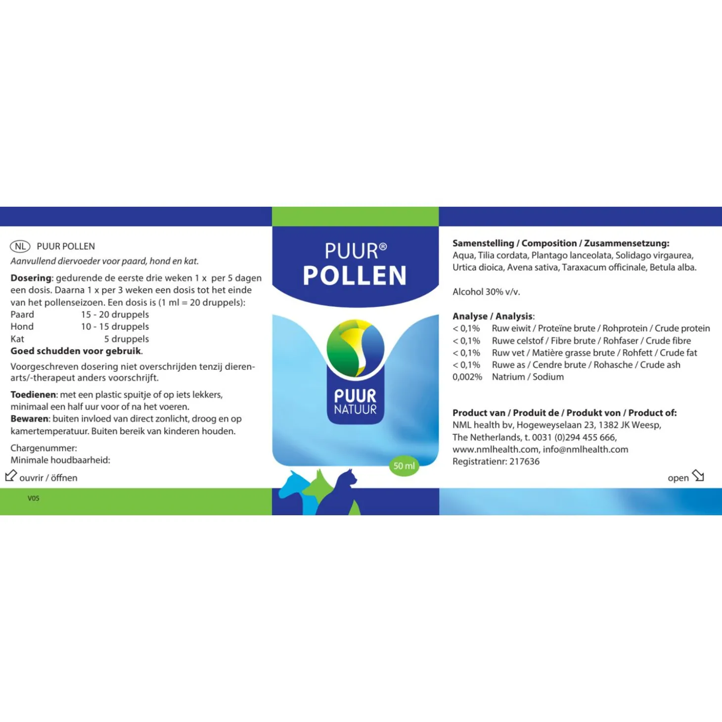 | Samenstelling | Aqua, Tilia cordata, Plantago lanceolata, Solidago virgaurea, Urtica dioica, Avena sativa, Taraxacum officinale, Betula alba. Alcohol 30% v/v. |