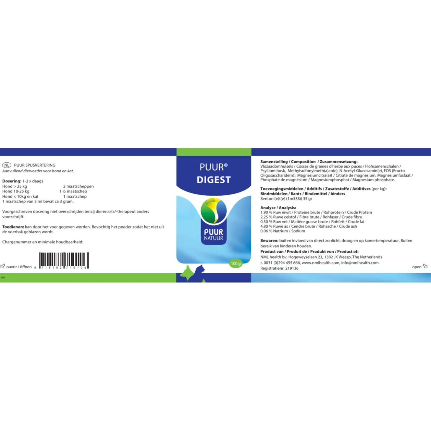 - Met Psyllium husk, Vlozaad, N-Acetyl-Glucosamine, Pre- en probiotica.