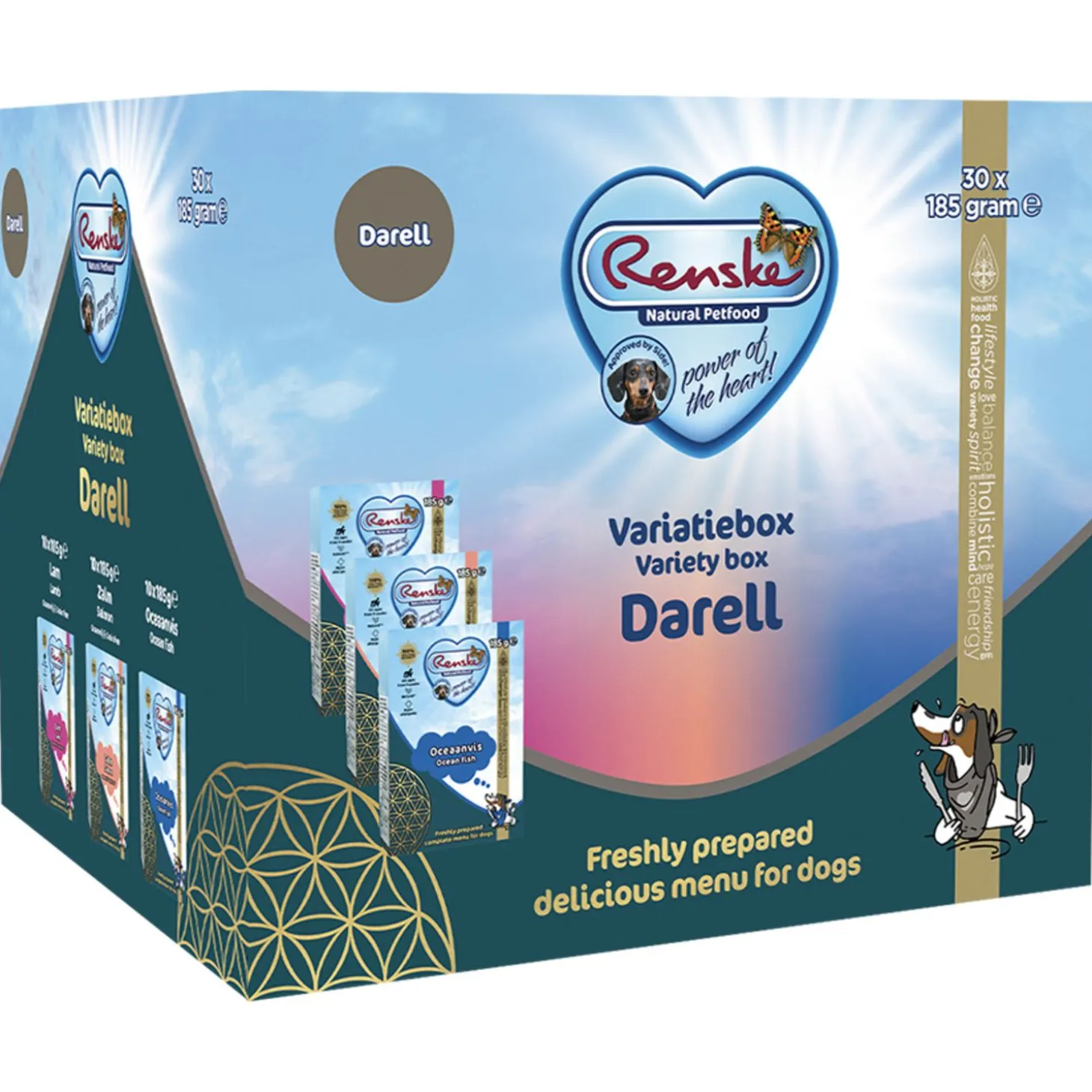 | Samenstelling | LamLam 70%, aardappel 4%, olijfolie 2,4%, erwten 1%, wortelen 1%, mineralen 0,5%, gedroogde algen (fucus vesiculosus) 0,3%, Xylo-oligosacchariden, duindoorn, yucca schidigera extract.ZalmZalm 55%, aardappel 10%, gedroogde algen (fucus vesiculosus) 0,06%, mineralen 0,04%, Xylo-oligosacchariden, duindoorn, yucca schidigera extract.OceaanvisOceaanvis 40%, waarvan tonijn 36% sardine 4%, gebroken rijst 4%, erwten 3%, wortelen 1%, zalmolie 0,7%, mineralen 0,18%, gedroogde algen (fucus vesiculosus) 0,06%, Xylo-oligosacchariden, duindoorn, yucca schidigera extract. |