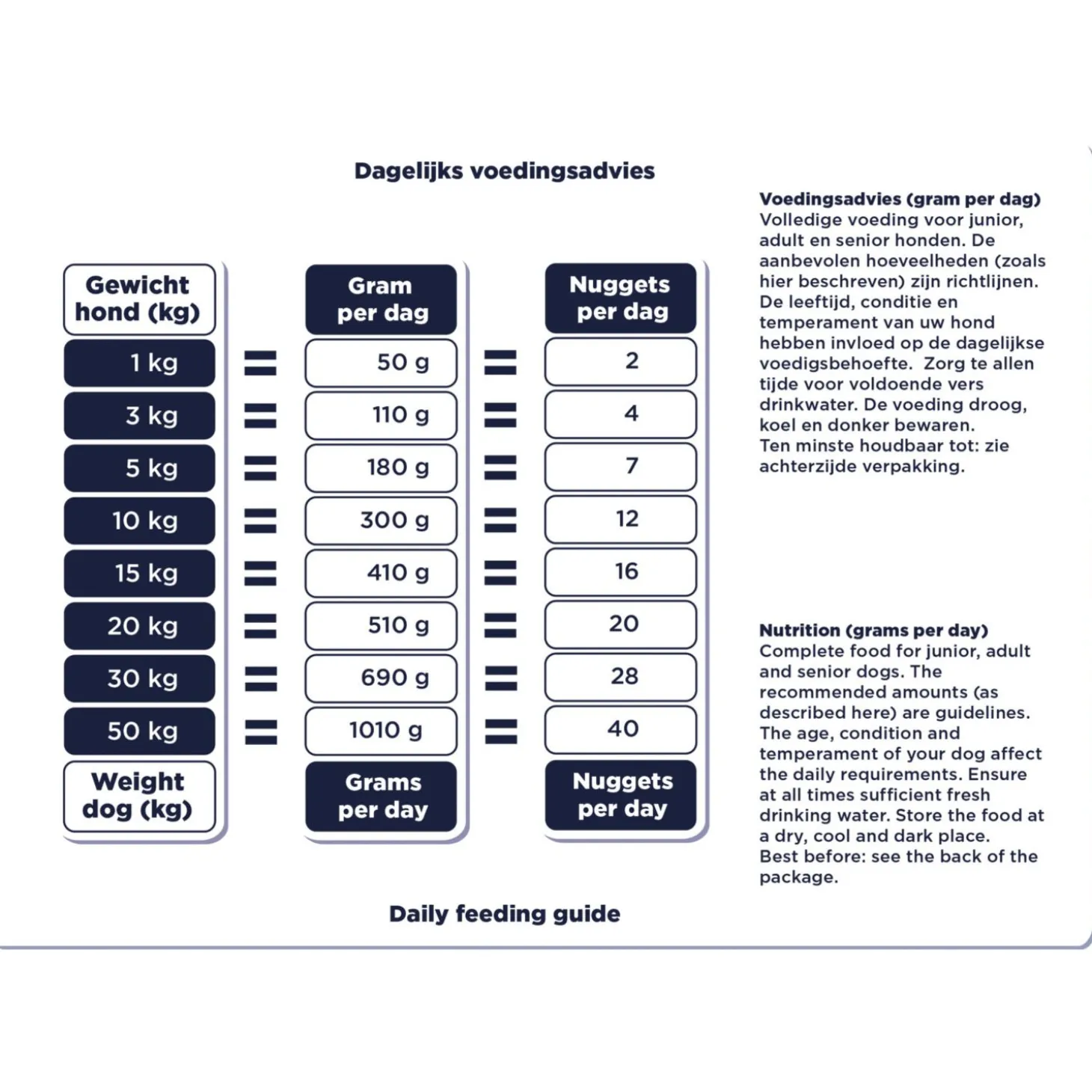 De voeding is handig te doseren door de speciale nuggetvorm. De voeding is graanvrij en is geschikt voor honden van alles rassen, vanaf 1 jaar oud. De maaltijd is aangevuld met lijnzaad (wat van nature een bron is van omega-3), groenten en fruit.
