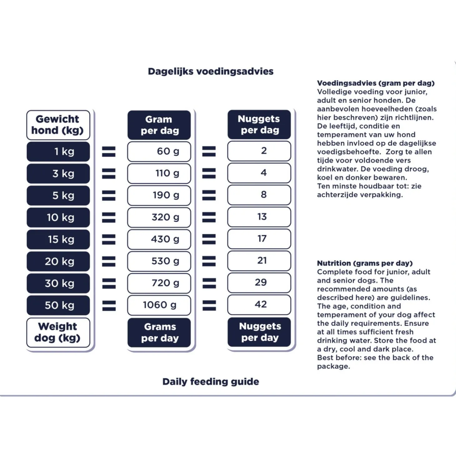 De voeding is handig te doseren door de speciale nuggetvorm. De voeding is graanvrij en is geschikt voor honden van alles rassen, vanaf 1 jaar oud. De maaltijd is aangevuld met lijnzaad (wat van nature een bron is van omega-3), groenten en fruit.