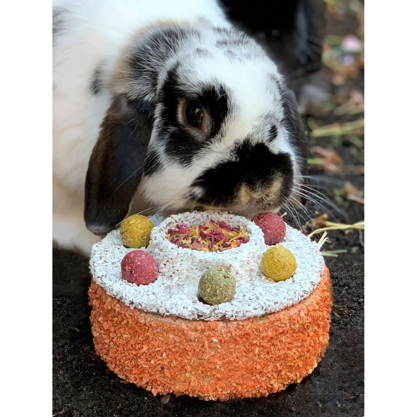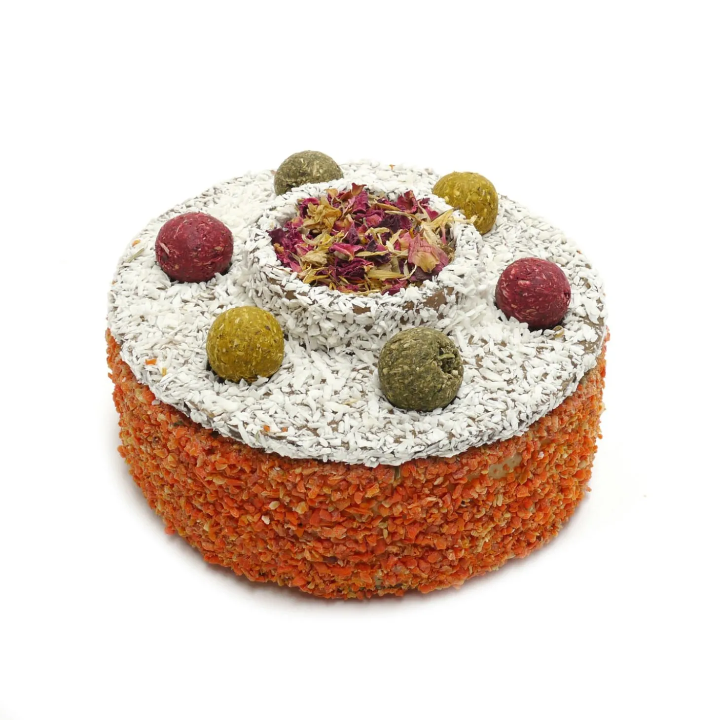 De taart is uiteraard veilig en geheel eetbaar. De buitenkant is bestrooid met wortel en kokos, op de deksel zitten kruiden- en groenteballetjes en een mix van bloemblaadjes. Als je de deksel opent, zit binnenin een heerlijke kruidenmix verwerkt. Als je knager de buitenkant heel houdt, kan je het bakje natuurlijk eenvoudig weer vullen met nieuwe snacks. Ook erg leuk om cadeau te geven!