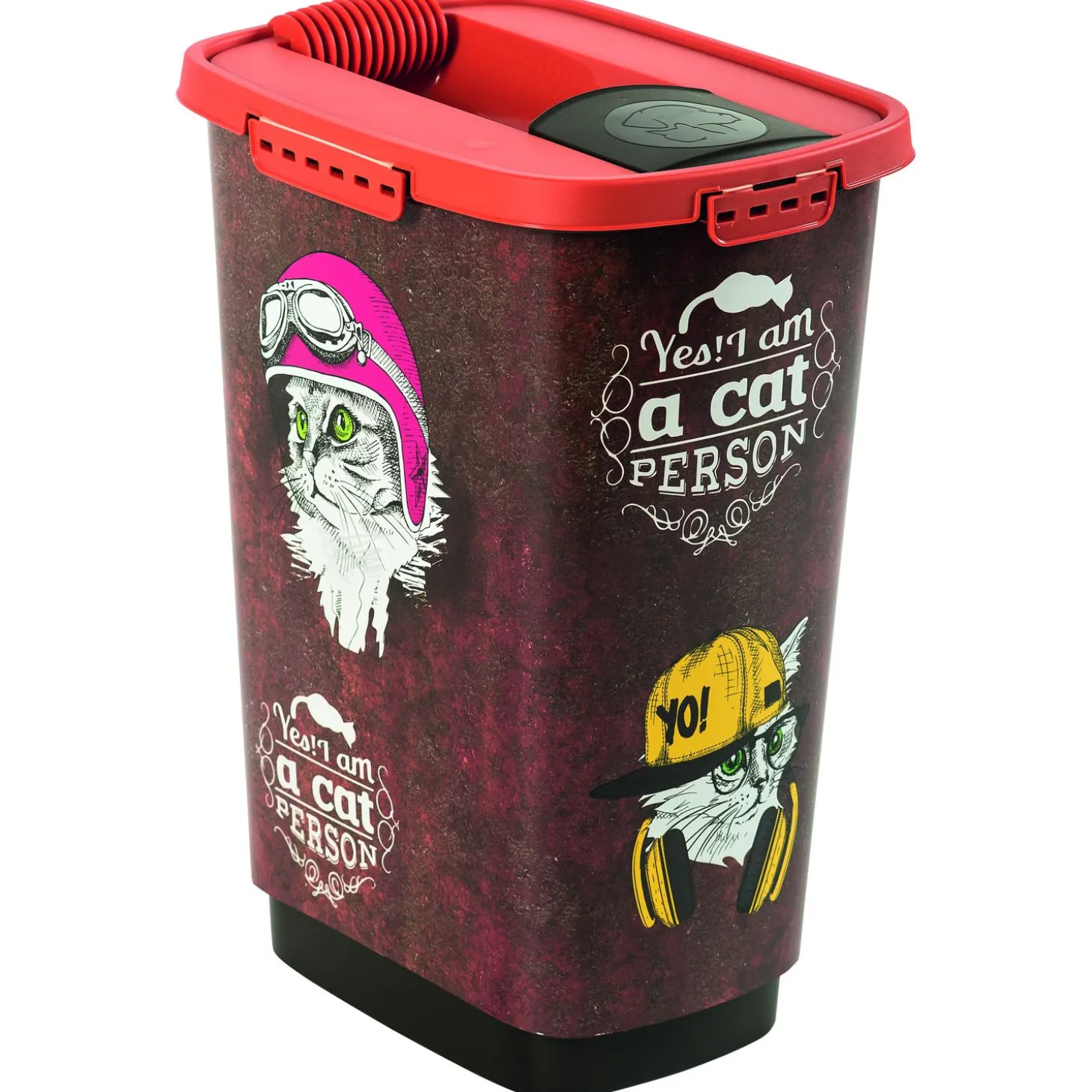 Met behulp van deze 25 liter container kan je nog makkelijker kattenbakvulling of voer bewaren. Dankzij de stevige sluitingen en de sealing in de deksel blijft alles wat je in deze speelse container doet lang goed. Deze bewaarbak heeft een handige greep en door de schenktuit is het voer of de kattenbakvulling makkelijk te schenken.