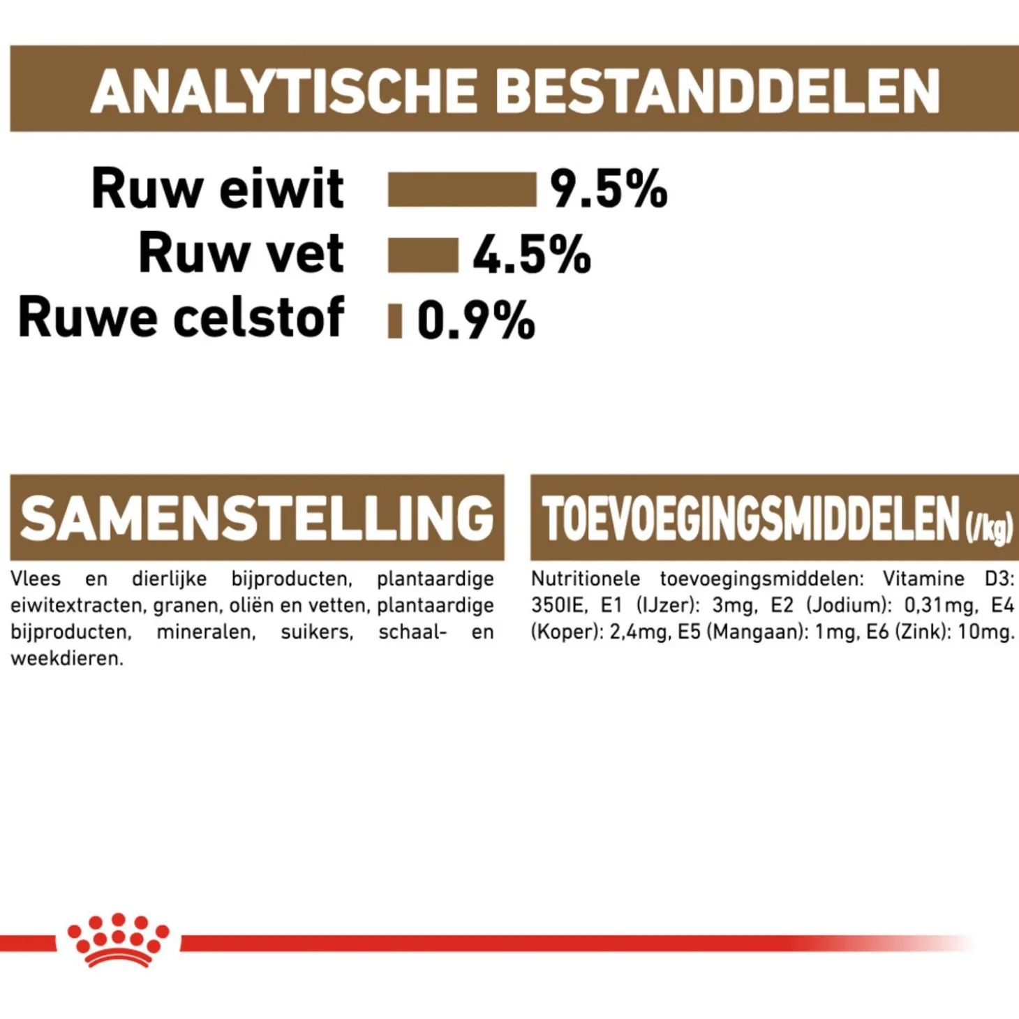 | Samenstelling | vlees en dierlijke bijproducten, granen, oliën en vetten, plantaardige eiwitextracten, plantaardige bijproducten, mineralen, schaal- en weekdieren, suiker |