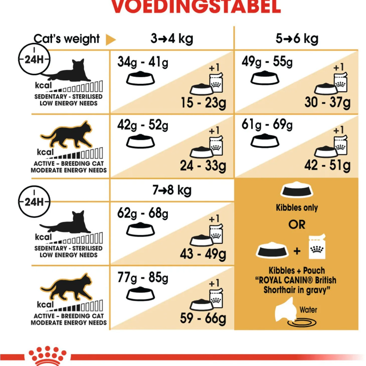 Royal Canin British Shorthair Adult is verkrijgbaar in 400 gr, 2 kg, 4 kg en 10 kg.