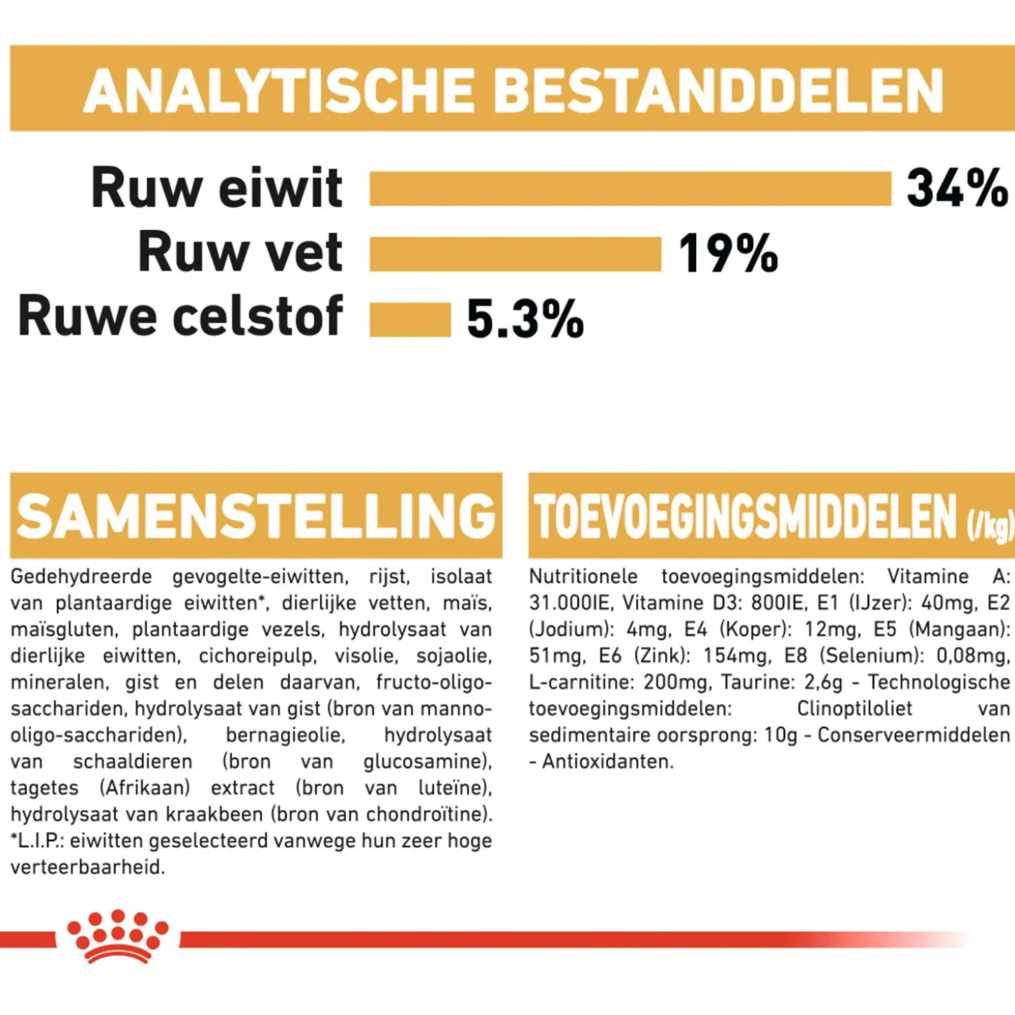 | Samenstelling | Gedehydreerde gevogelte-eiwitten, isolaat van plantaardige eiwitten*, rijst, maïs, dierlijke vetten, maïsgluten, plantaardige vezels, hydrolysaat van dierlijke eiwitten, cichoreipulp, mineralen, sojaolie, visolie, fructo-oligo-sacchariden, hydrolysaat van gist (bron van manno-oligo-sacchariden), bernagieolie, hydrolysaat van schaaldieren (bron van glucosamine), tagetes (afrikaan) extract (bron van luteïne), hydrolysaat van kraakbeen (bron van chondroïtine) *l.i.p.: hoogwaardige eiwitten die zeer goed verteerbaar zijn. |