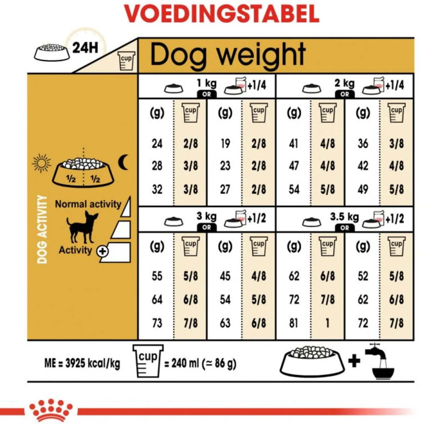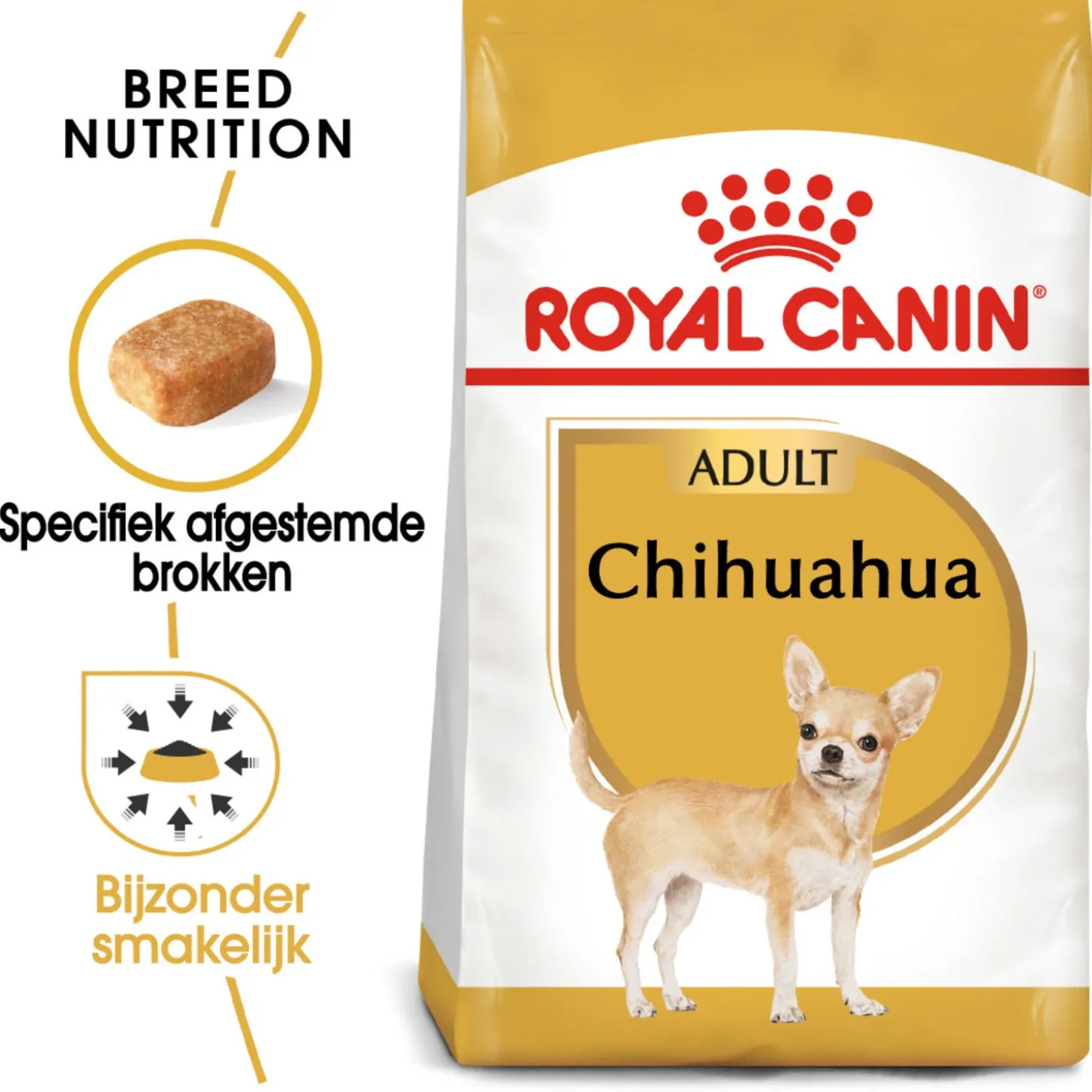 Royal Canin Chihuahua Adult is verkrijgbaar in 500 gr, 1,5 kg en 3 kg.