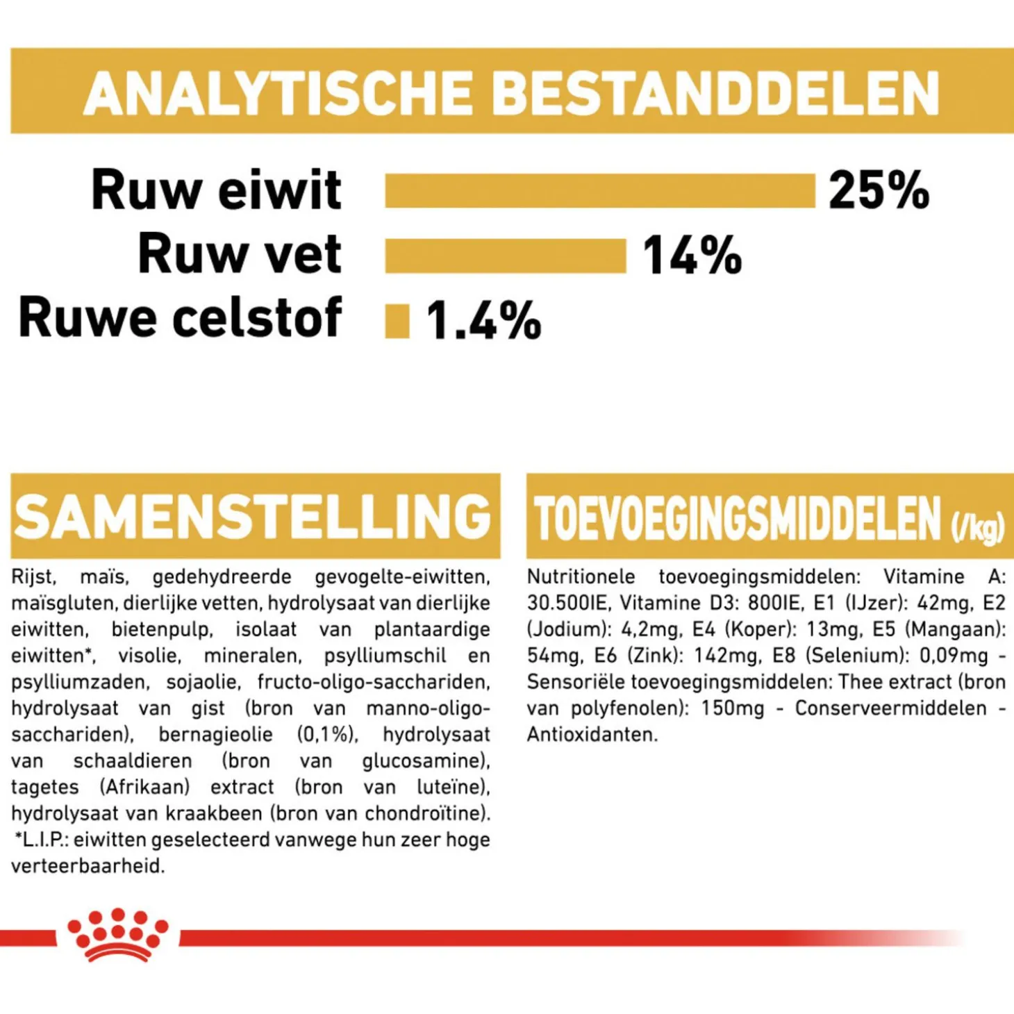 | Samenstelling | Rijst, maïs, gedehydreerde gevogelte-eiwitten, maïsgluten, dierlijke vetten, hydrolysaat van dierlijke eiwitten, bietenpulp, isolaat van plantaardige eiwitten*, visolie, mineralen, psylliumschil en psylliumzaden, sojaolie, fructo-oligo-sacchariden, bernagieolie (0.1%), hydrolysaat van schaaldieren (bron van glucosamine), tagetes (afrikaan) extract (bron van luteïne), hydrolysaat van kraakbeen (bron van chondroïtine), hydrolysaat van gist (bron van manno-oligo-sacchariden) *l.i.p.: hoogwaardige eiwitten die zeer goed verteerbaar zijn. |