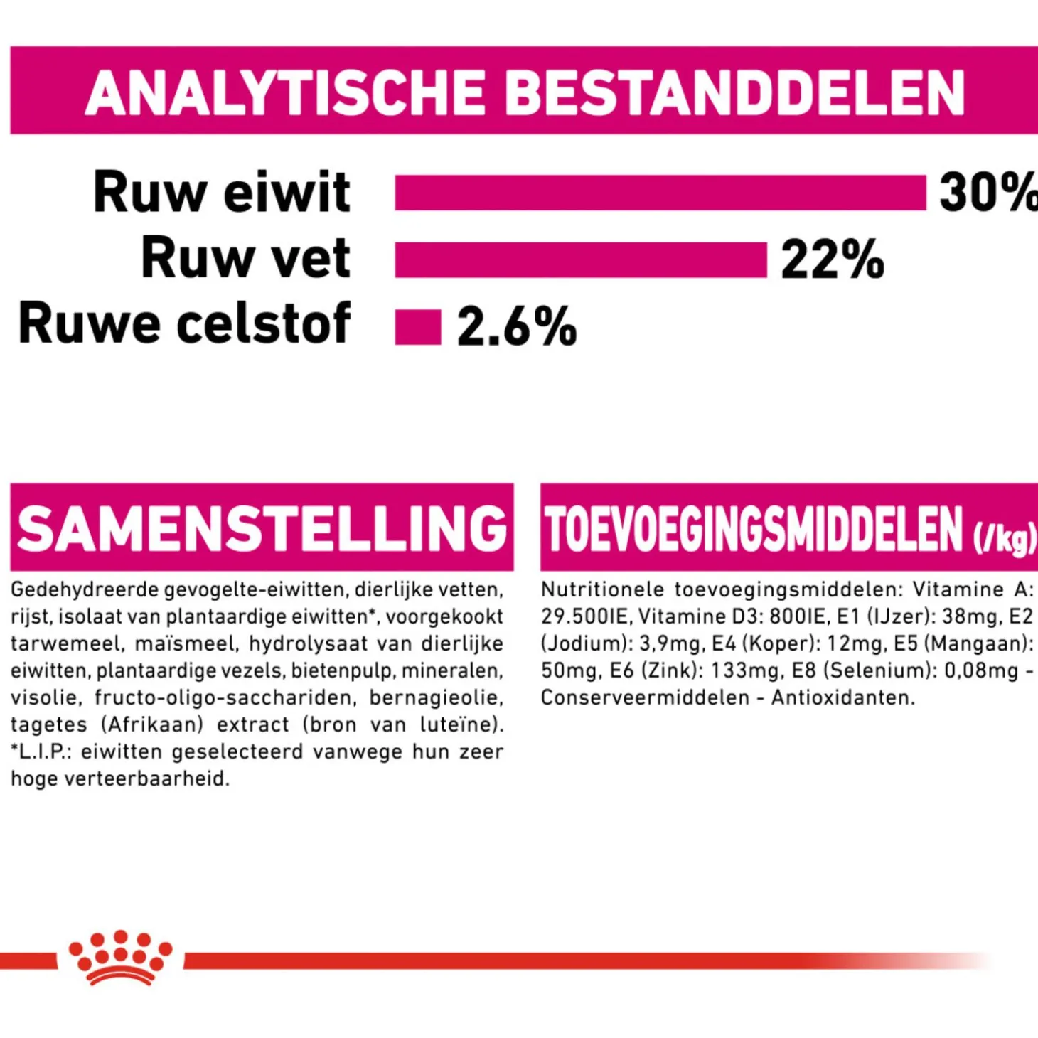| Samenstelling | Dierlijke vetten, voorgekookt tarwemeel, rijst, isolaat van plantaardige eiwitten*, hydrolysaat van dierlijke eiwitten, maïsmeel, plantaardige vezels, bietenpulp, visolie, mineralen, fructo-oligo-sacchariden, gedehydreerde gevogelte-eiwitten, bernagieolie, tagetes (afrikaan) extract (bron van luteïne) *l.i.p.: hoogwaardige eiwitten die zeer goed verteerbaar zijn. |
