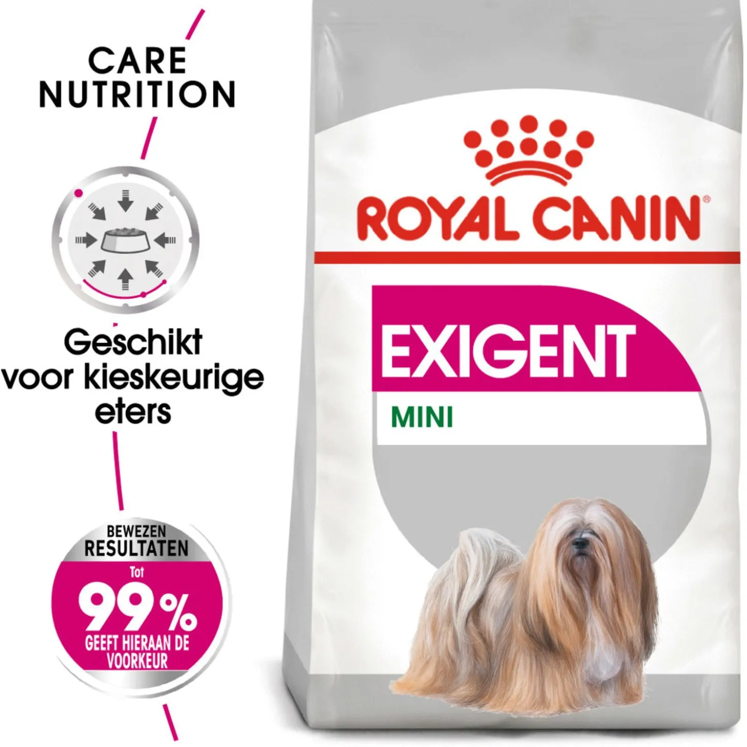 Exigent Mini is een bewezen succes. Wetenschappelijke testen in de kennels van Royal Canin hebben aangetoond dat maar liefst 99 procent van de honden de voorkeur geeft aan deze voeding.