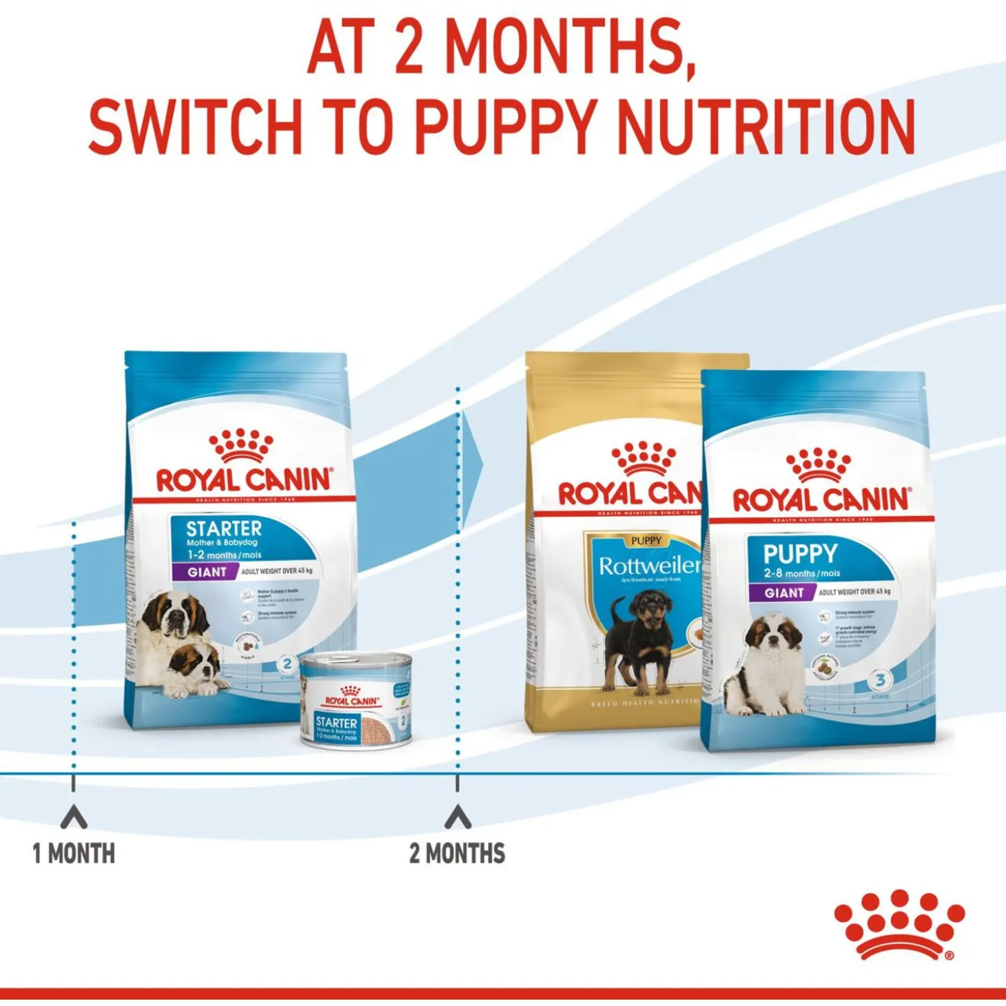 Wanneer je pups rond de 2 maanden oud zijn, zullen hun voedingsbehoeftes weer veranderen. De puppy’s hebben dan een voeding nodig die past bij de volgende groeifase. Het is dan ook aan te raden om op een leeftijd van 2 maanden over te stappen op Royal Canin Giant Puppy.