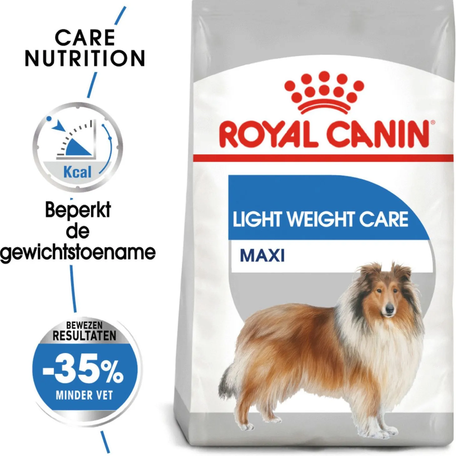 Royal Canin Light Weight Care Maxi is verkrijgbaar in 3 kg en 10 kg.