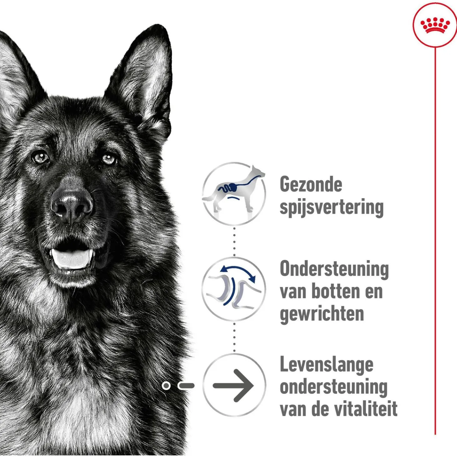 Een grote oudere hond kan in gewicht toenemen als hij minder beweegt dan in zijn jongere jaren. Het is belangrijk zijn gewicht nauwkeurig in de gaten te houden zodat hij vrij kan blijven bewegen. De exclusieve formule met hoogkwalitatieve eiwitten, zoals het zeer goed verteerbare L.I.P., en uitgebalanceerde voedingsvezels bevorderen de optimale spijsvertering.